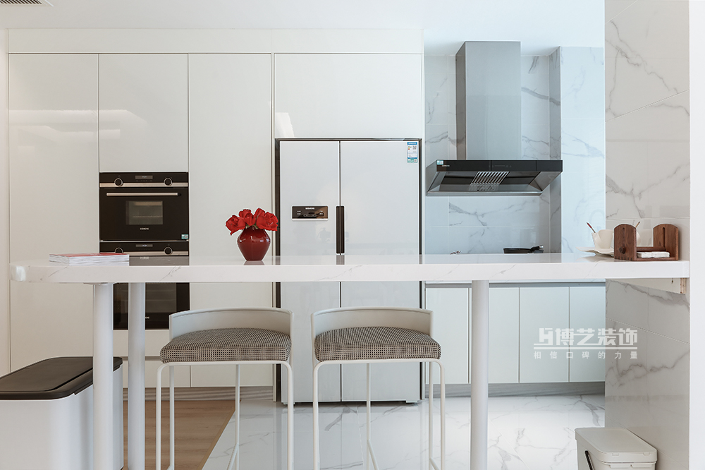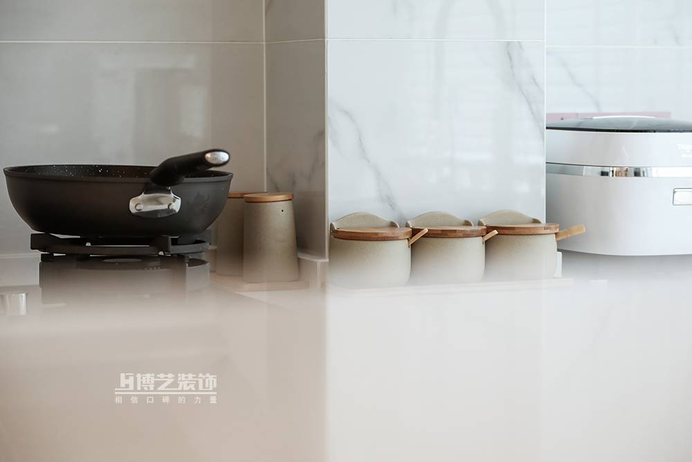 全开放的格局,设计师依旧以白色为基底,不掺杂一丝杂色,营造出干净、简洁的视觉感官。柴米油盐的烟火气与艺术的设计感相迎,还原一片至静、至远、至真、至雅的生活意境。