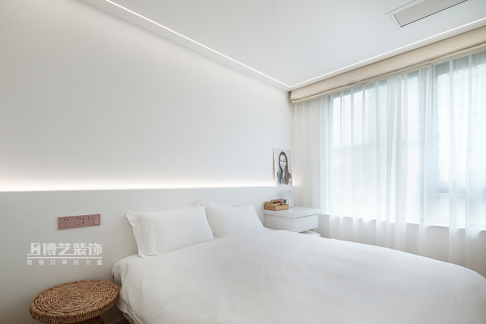 宁静美好的白色空间,抛弃杂念,营造一个和谐、安宁的睡眠氛围,床头微弱的灯光饱满的安全感,伴你轻松入眠。