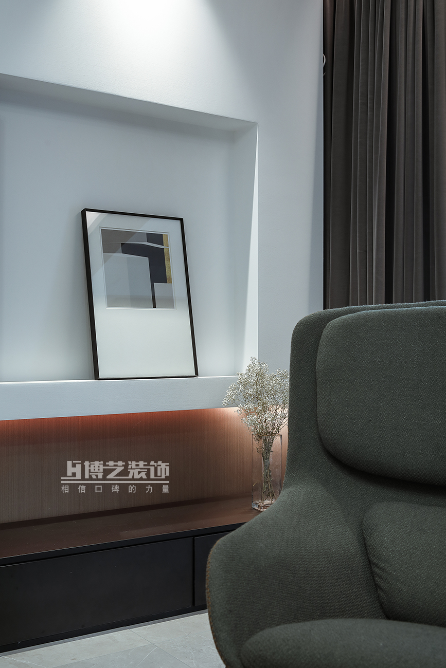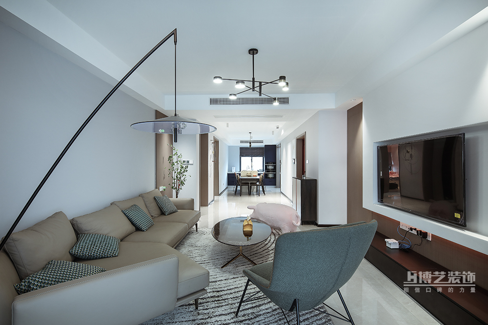 客厅受原始结构的限制,设计师把落座的沙发放置在较宽裕的一面提升舒适感,次卧的门采用隐形门的设计,很大程度上扩大了原本电视背景墙的宽度,色彩上以白色做中色,调和莫兰迪蓝色与棕色的碰撞,丰富空间层次感。
