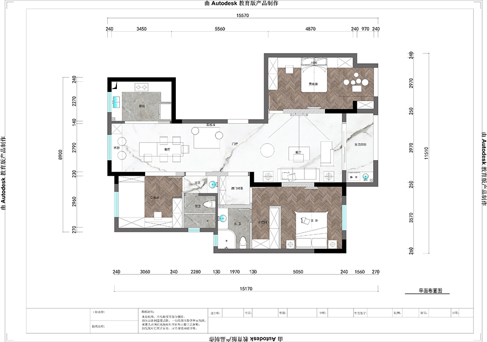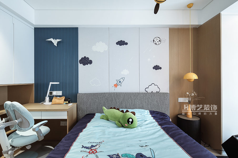 由于男孩在学习架子鼓,所以设计师把小阳台打作为练习区,用蓝色、棕色、灰色三中颜色,不同材质的造型背景表达男孩活泼好动的性格。