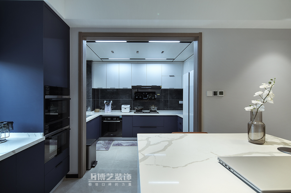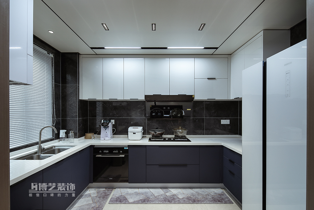 厨房改掉传统集成吊顶,采用大板吊顶嵌入线性灯光,提升颜值,色彩上与西厨一致形成里外呼应。