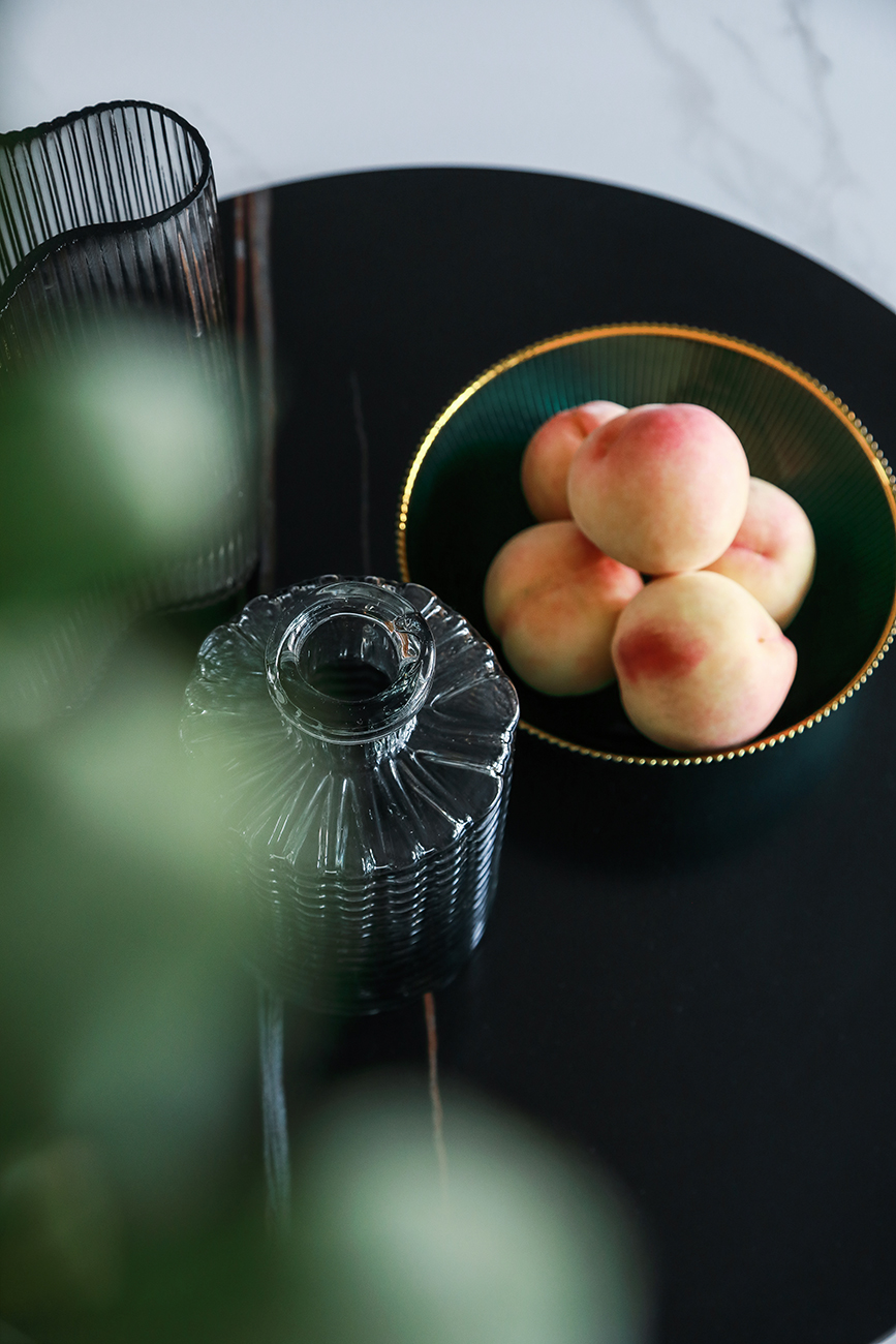 利用空间制作的一组蓝灰色餐边柜,呼应客厅,增加空间的统一性,兼具的收纳及展示功能更具实用性。大理石餐桌搭配米色系餐椅,硬朗中带着柔情,于无声处彰显优雅,搭配桌边精致的隔断,金属的质感提升整体格调。