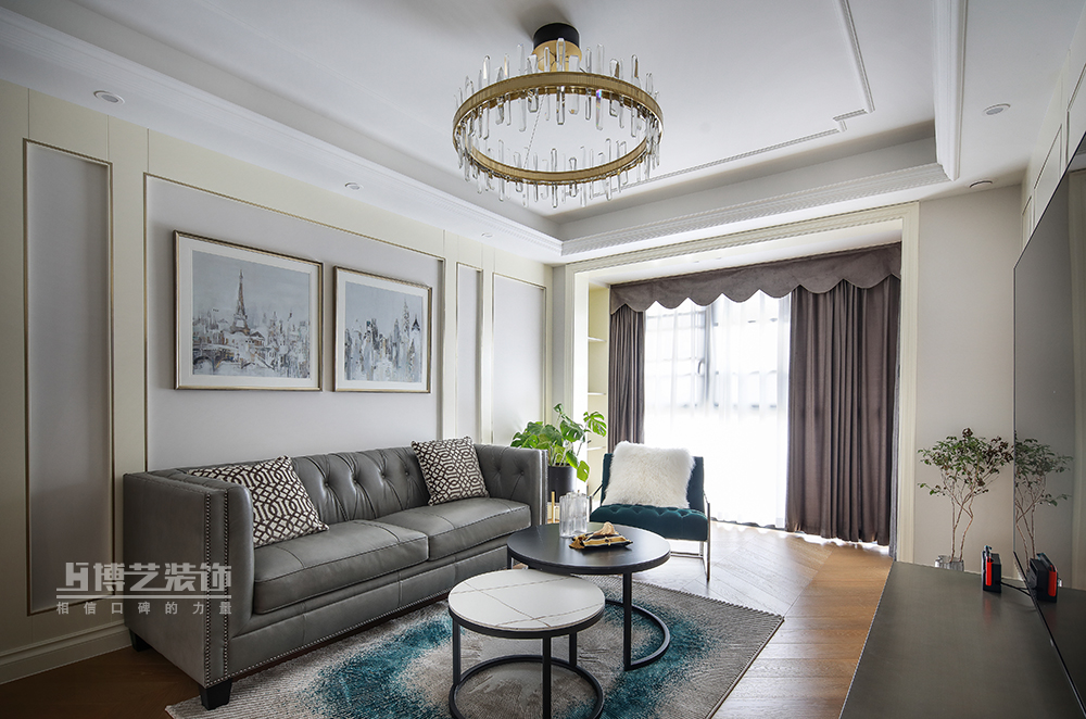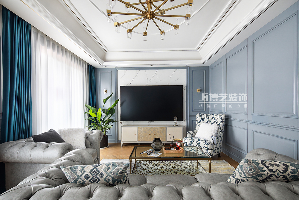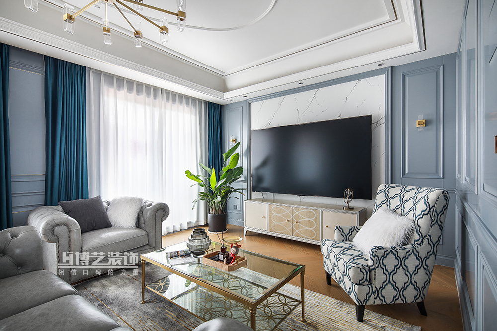 蓝灰色的主色调,以高饱和的孔雀蓝做点缀,提升空间美感,大片的光自然纳入,通透、宽敞,犹如雨后带来的自然清新,让人沉浸。