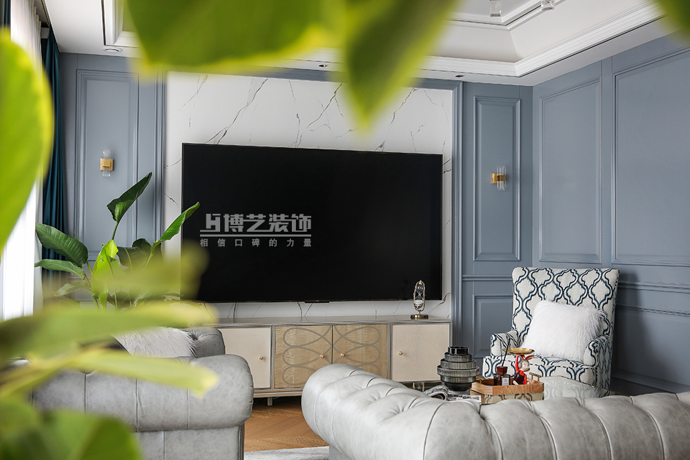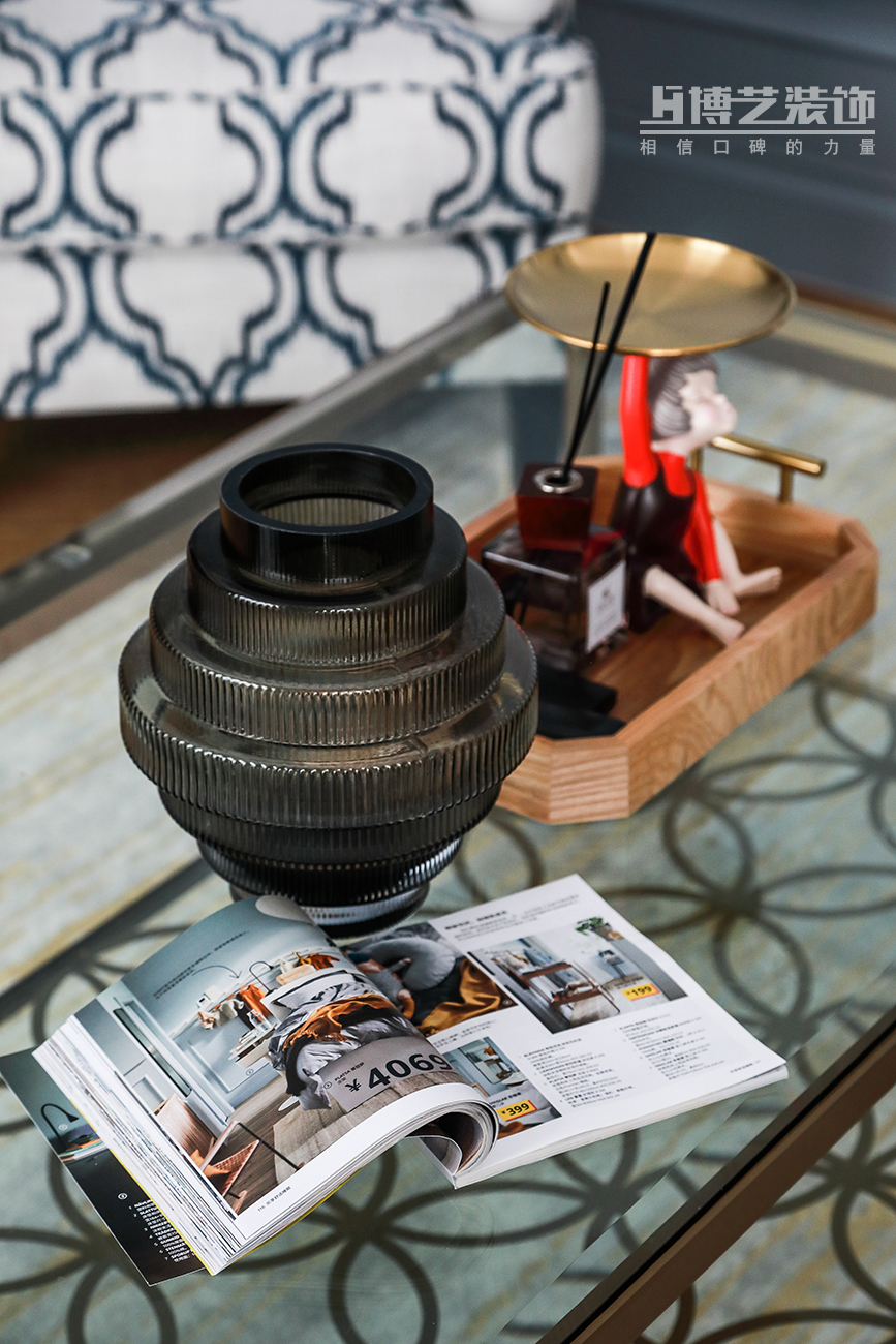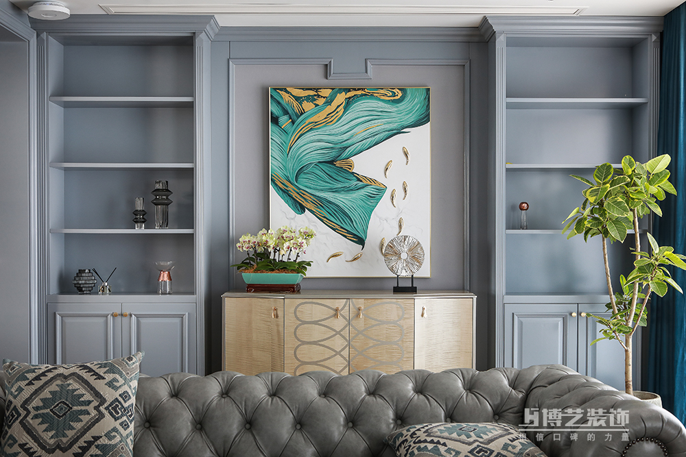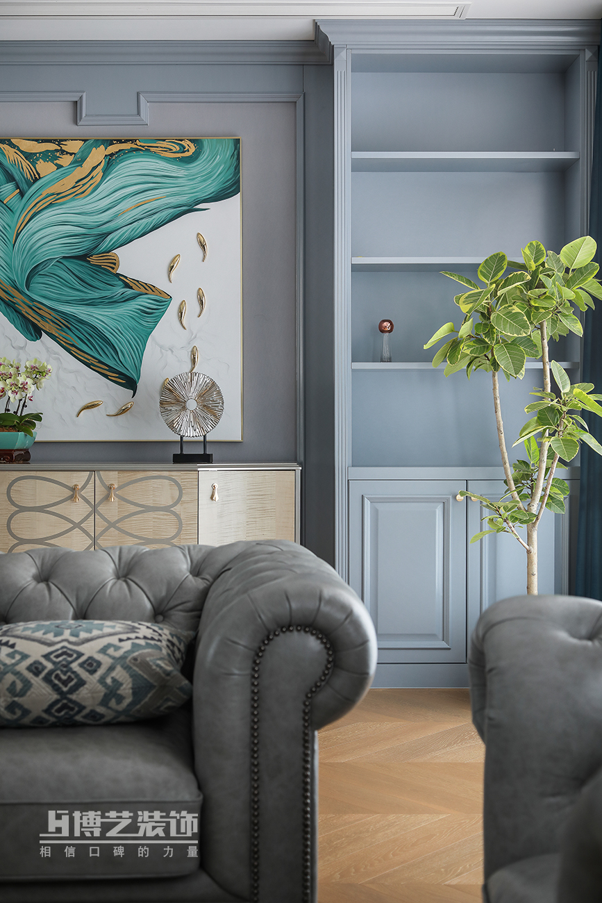 水洗皮的灰色沙发,搭配蓝白大花单椅,舒服的色系搭配,清爽大气更添一份家的温馨感,精致的软装陈设,提升整体的品质感。