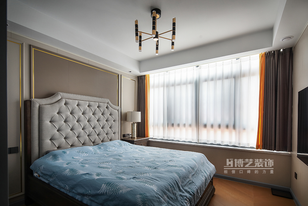 拼色的背景墙往外舒展,延伸视觉,澄净的蓝色与白色搭配,塑造美好素静的居室氛围,木质的床头增添了几分质朴的气息,安静的感觉不断扩散。