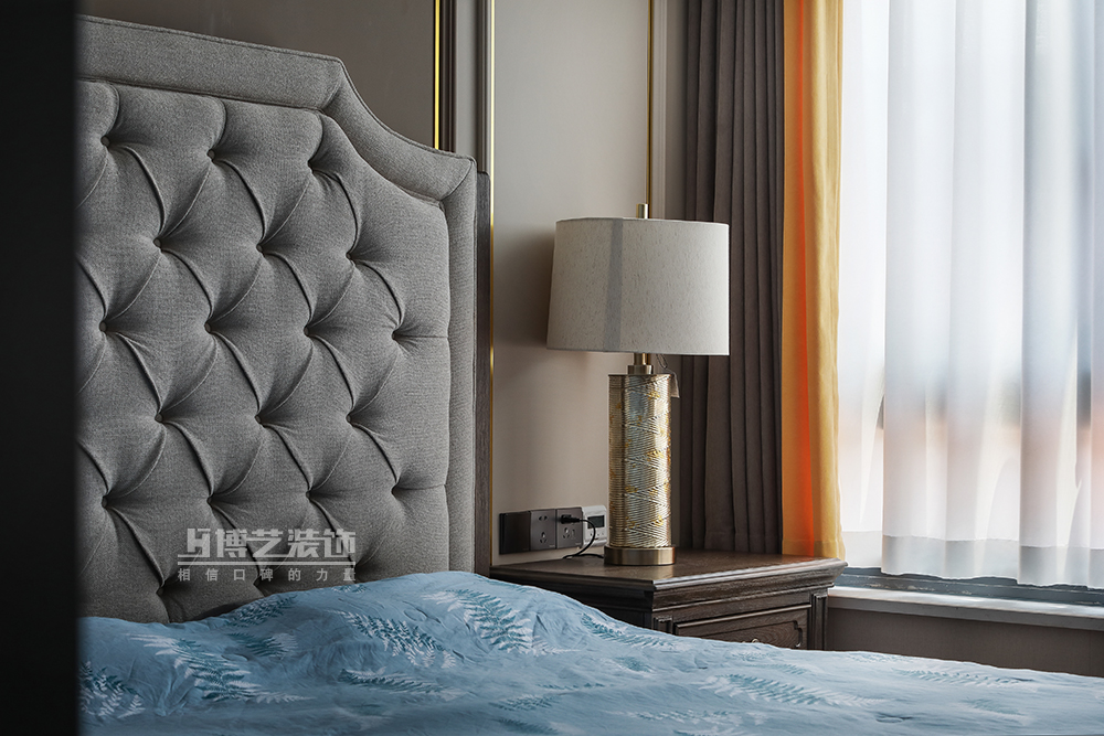 一楼的老人房,简洁素雅,以不同饱和度的咖啡色营造安静而放松的睡眠氛围,添加的金属线条,在光的作用下,泛着流光,提升空间品质。