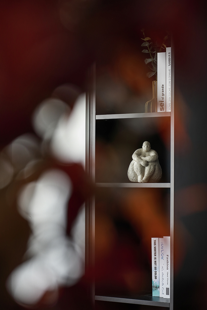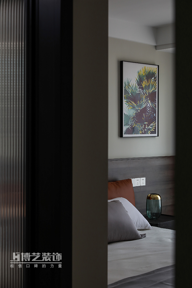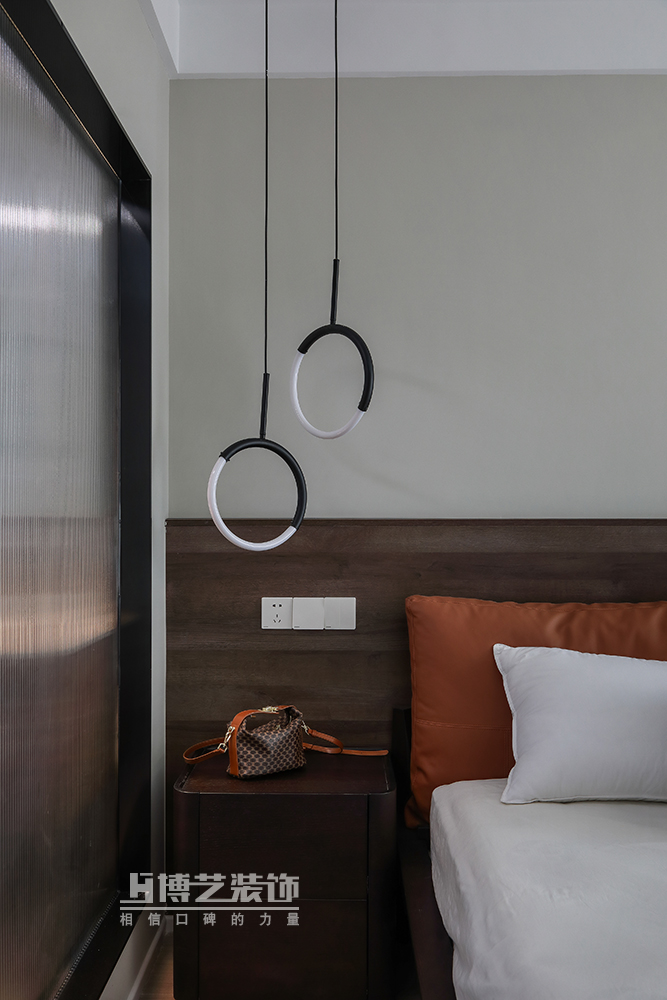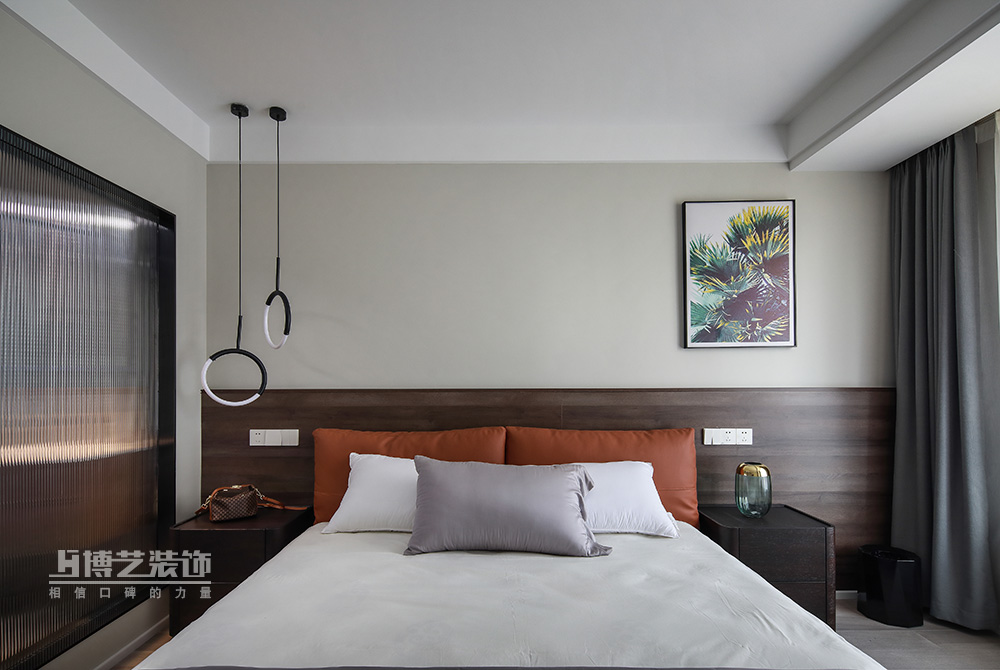通透的格局使光线充分涌入,浅草灰赋予的清冷与木作沉淀的细腻互为羁绊,细细铺展,床头橙色的软枕弱化了空间的单薄,饱满了一室热烈的浪漫。