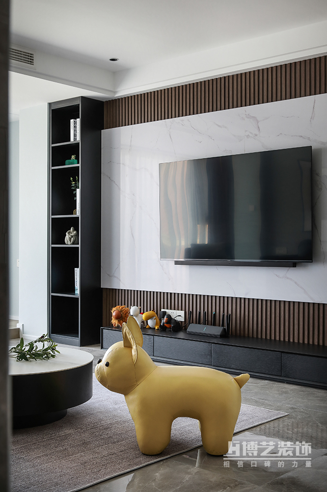 简单的硬装线条勾勒出客厅的开阔空间,黑色的皮质沙发置于其中,在光与影的微妙律动中,稳稳的拿捏着气质,色彩丰富的卡通玩偶消弭了这素色场域里的冷傲,带来温馨与生气。