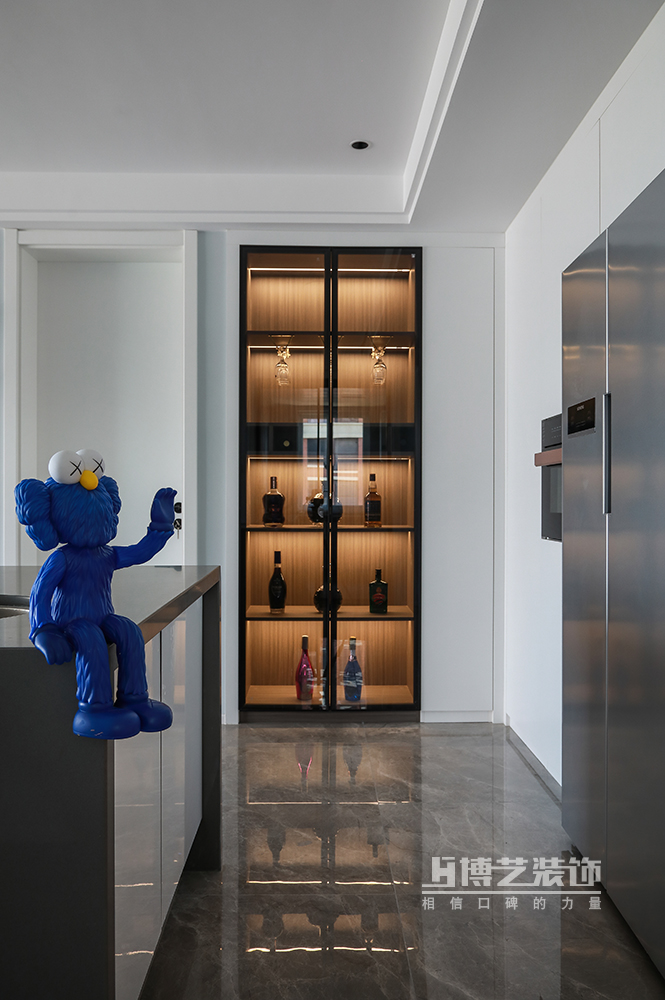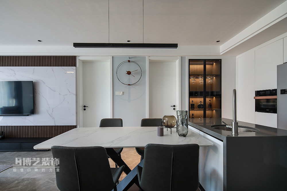 餐厅延续客厅的极简风格,设计了岛台,增加西厨功能,丰富主妇烹调美食的乐趣。一侧的餐边柜作为男主人收藏之用,灯光与灰玻的结合也是视觉上妥妥的C位。