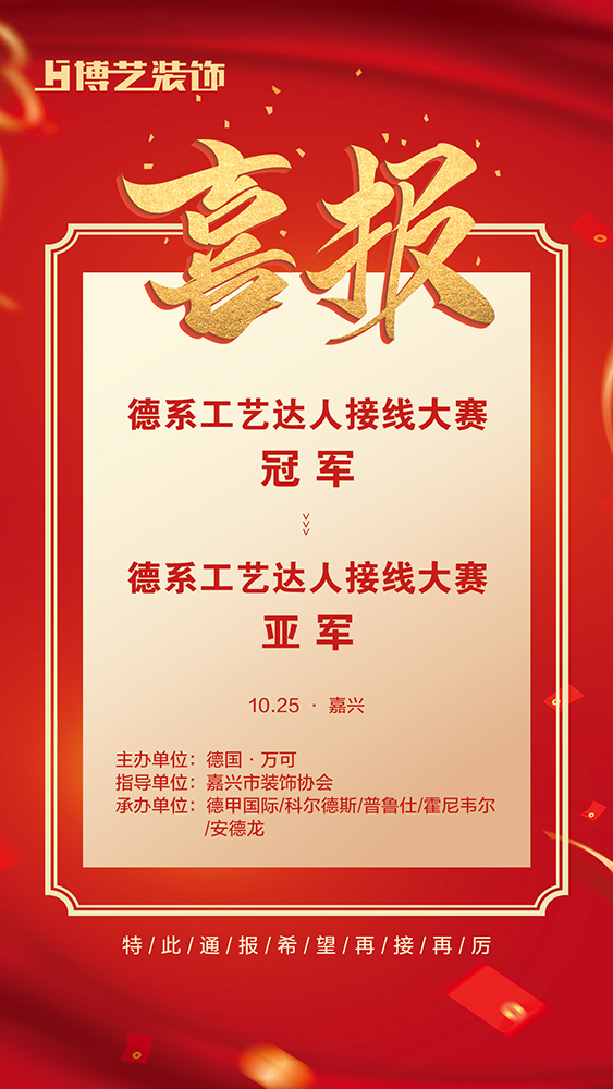 2021年10月25日,在嘉兴中港城举行的德国万可德系工艺达人接线大赛中,博艺装饰的电工师傅们以过硬的工艺技能和稳定的心理素质脱颖而出,分别荣获比赛冠军和亚军的殊荣。