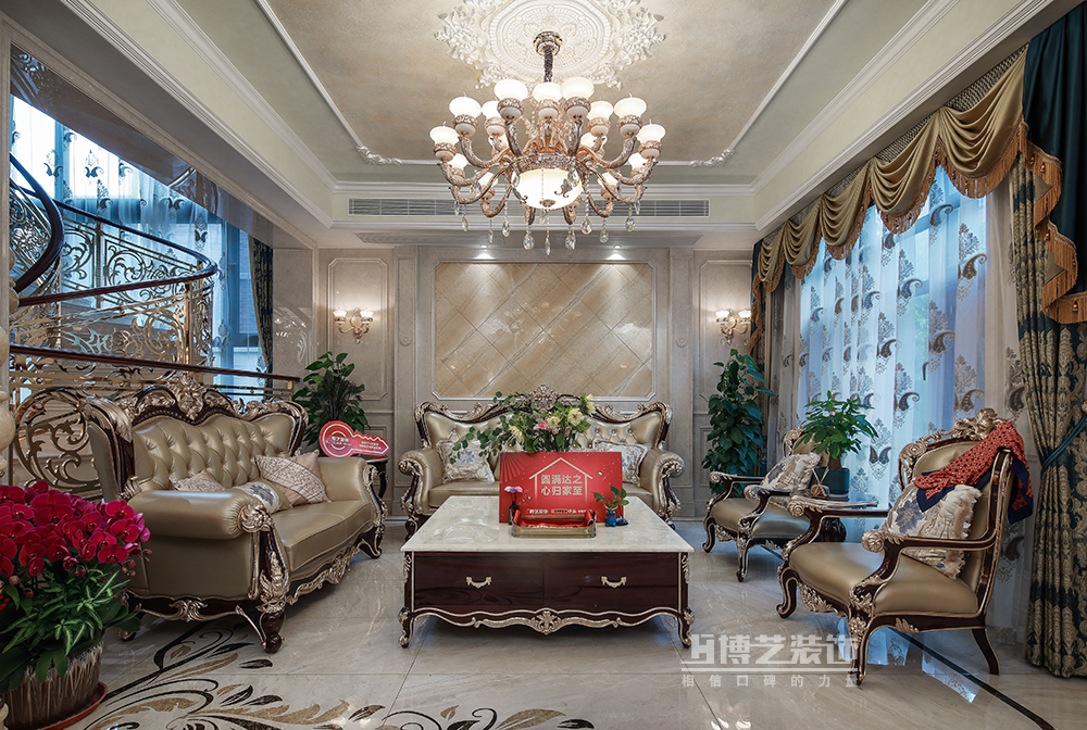 客厅以浪漫主义为主导,在大理石与线条打造的法式框架下于细节处表现巴洛克的精雕细琢,以华丽的软装,浓烈的色彩,精美的造型烘托高贵优雅的居家环境。