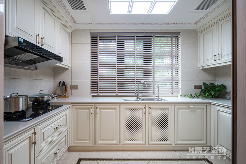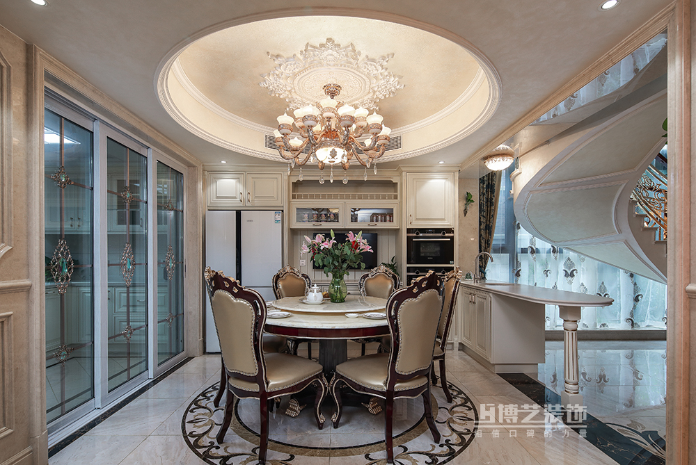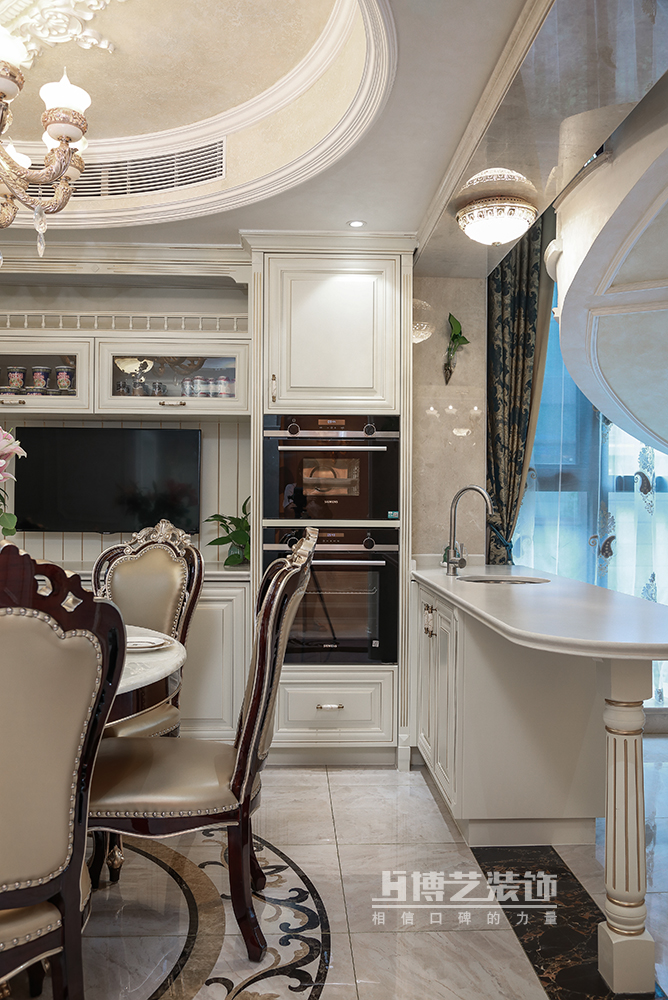 圆形的吊顶搭配经典的法式雕花,造型古朴的水晶灯,使整个空间看起来富含韵律感且大方典雅,奶白色的橱柜为整个空间带来柔美的气质,水吧台的设计与其他空间形成互通,在视野上得到拉伸。