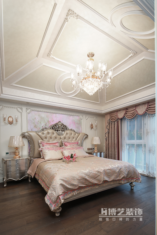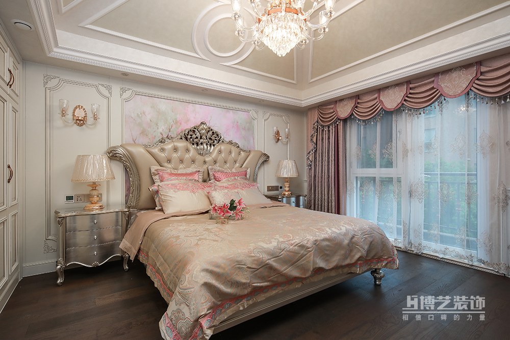 法式复古吊顶,华丽水晶灯,粉色窗帘将优雅、浪漫的因子复刻进这白色的空间里,雕花的法式大床让卧室变得更加高雅,床头泛着银色的床头柜更是增添了几分华丽与时尚的气息。