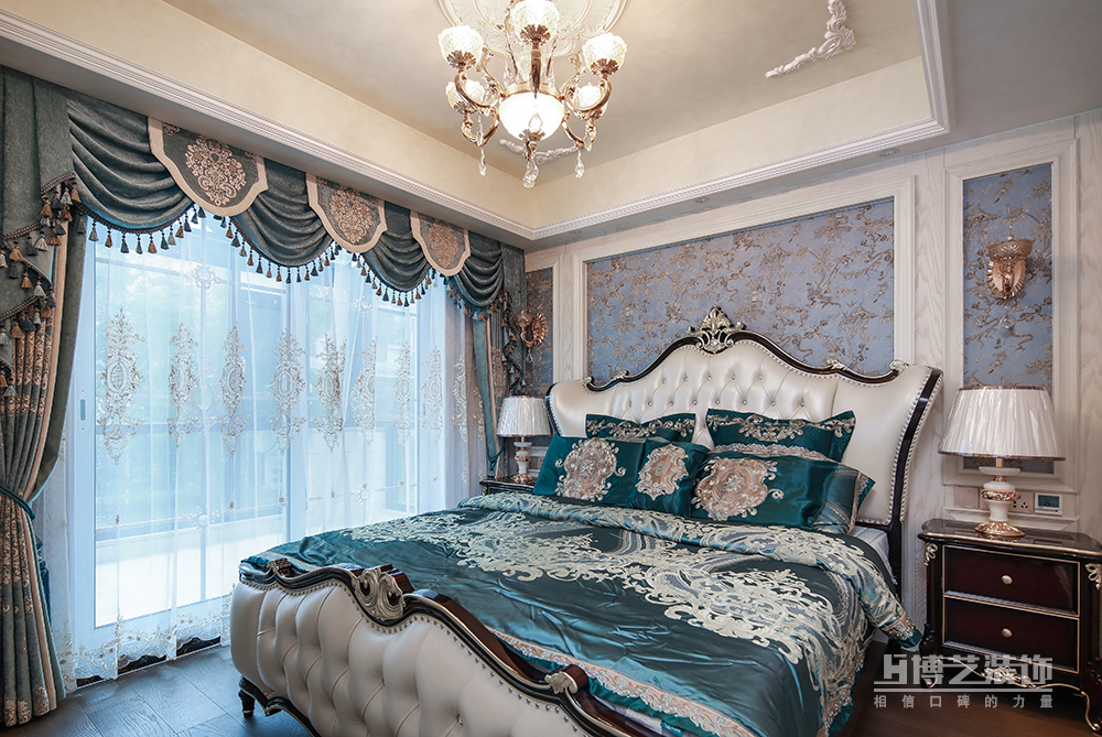 次卧背景以木饰面与印花壁纸作结合,以简饰繁,尊贵典雅的气氛扑面而来,层次递进的蓝色提升了空间的层次感,奢华而静谧的气息充满家居。