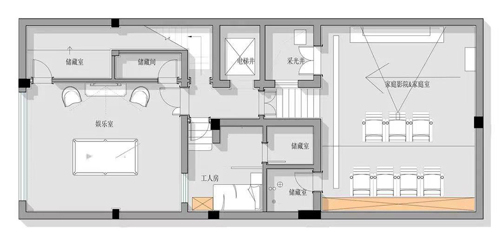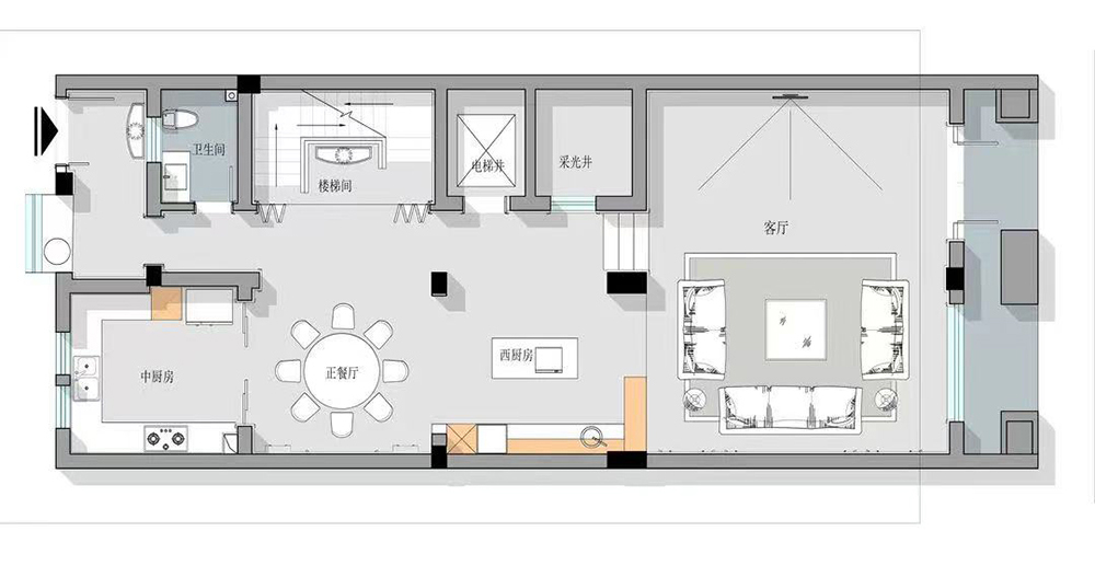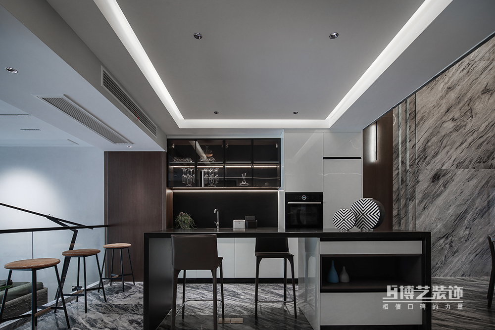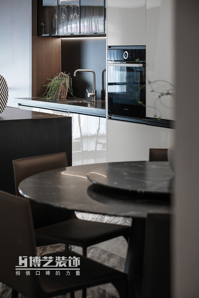 “西厨—餐厅—厨房”空间互通,形成完备、便捷的功能呼应,分担家务,共享佳肴,空间与行为关系达成和谐的生活感受。