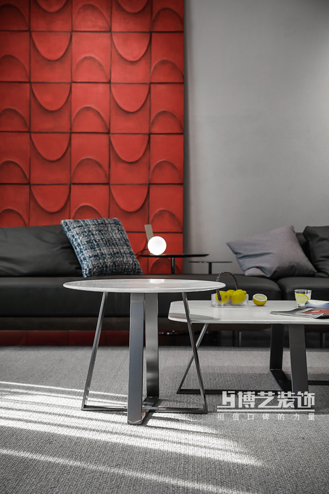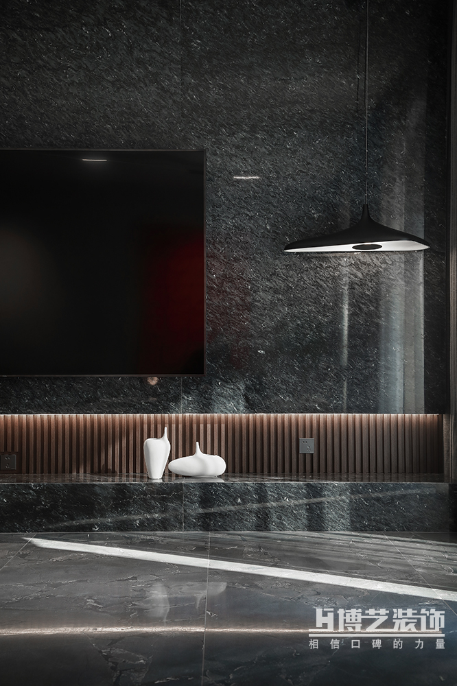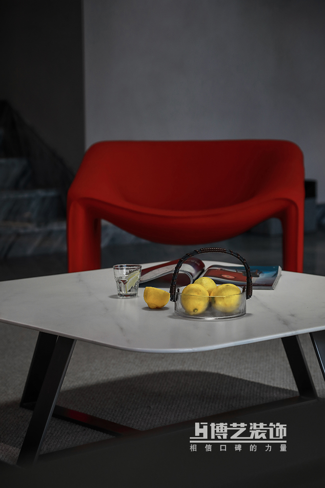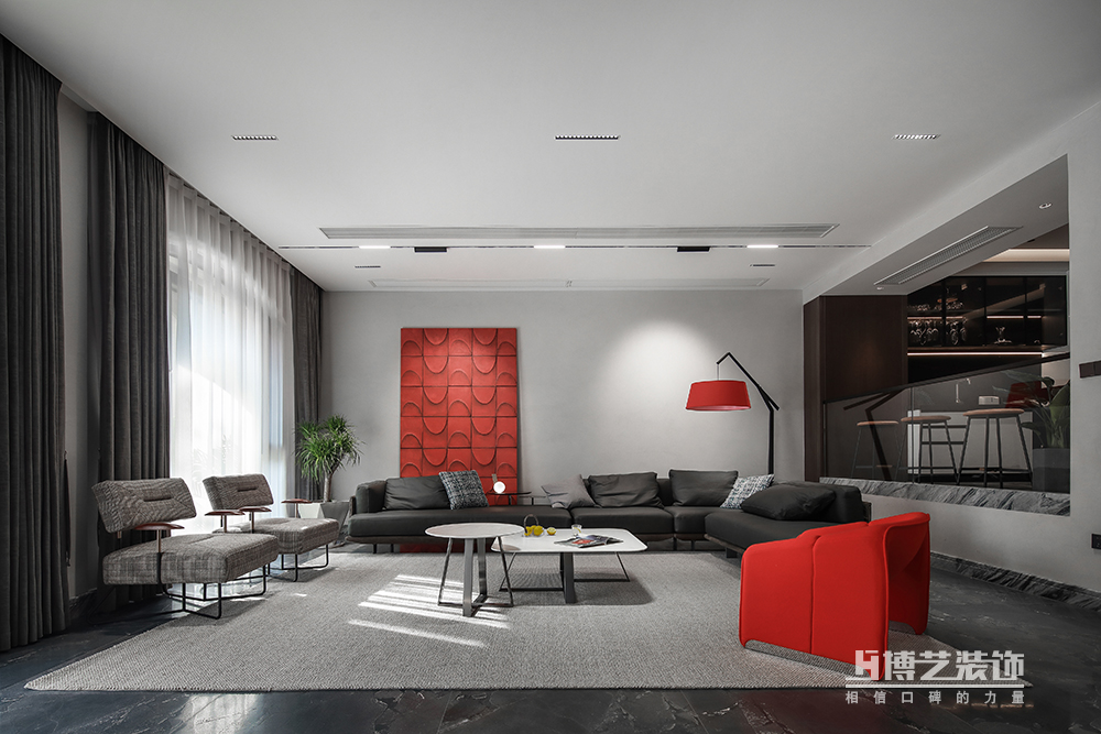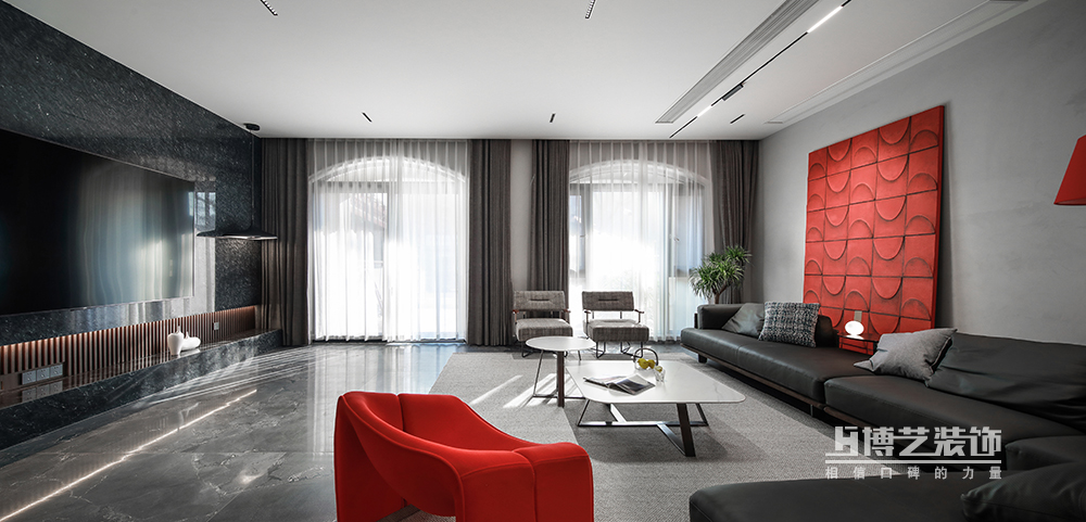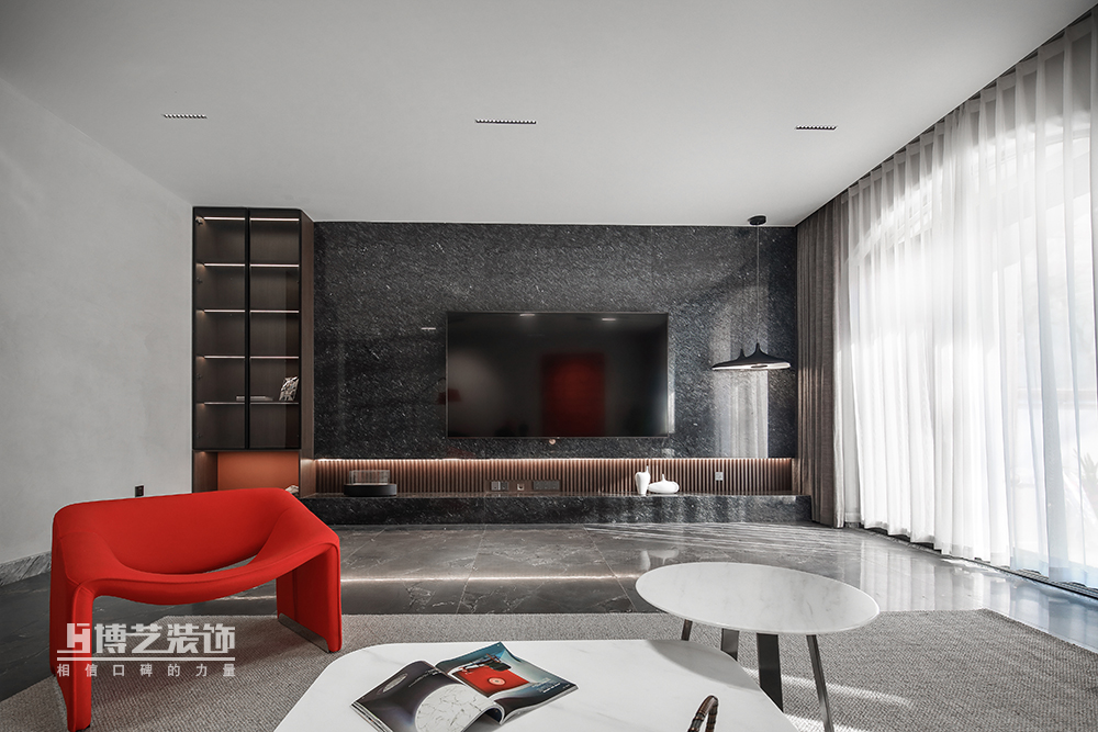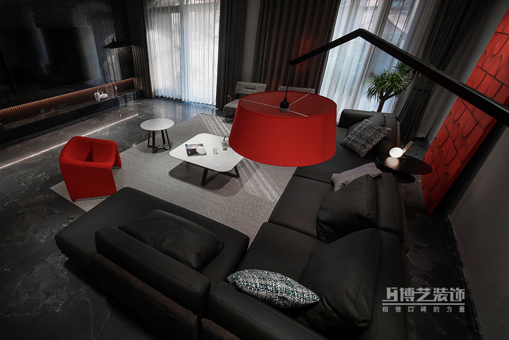 客厅的公共空间承载着家庭生活的无数可能性。以自由、无界的概念展开,在充分宽敞的空间里,黑色自带的厚重感被一抹朱砂红的跳跃完美缓解,与光影的更迭变幻,包容了动与静,嬉闹与沉默。