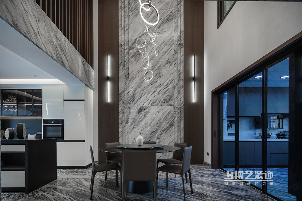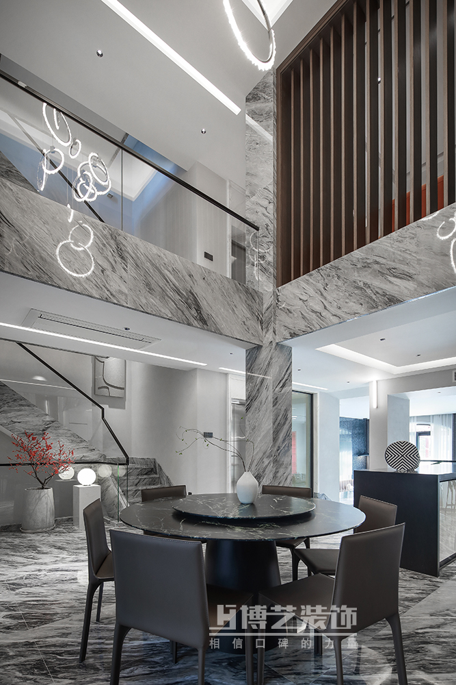中间挑空的用餐区,纵向的延伸让空间自由的舒展,别样的现代化吊灯,环环相扣,倾泻而下的光线与大理石互染提升了用餐的氛围。