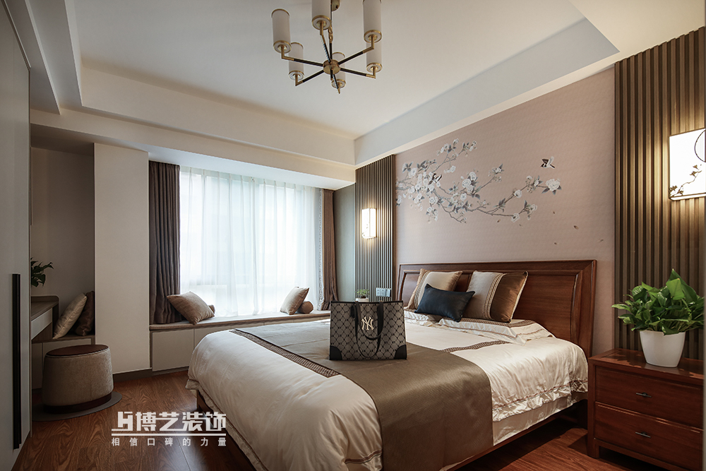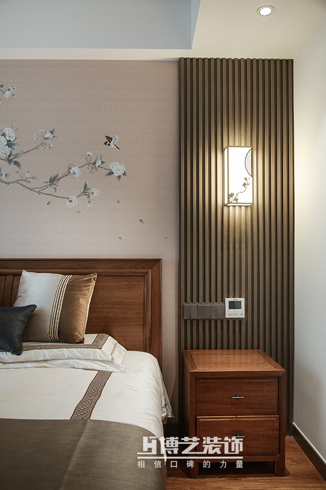 主卧的设计依旧贯穿新中式的设计概念,木格栅与花鸟画以现代的工艺材质重新表现,呈现出品质的美感,透露着主人的品味。