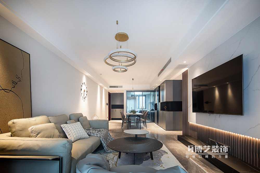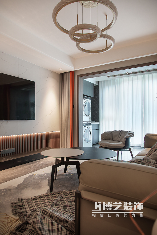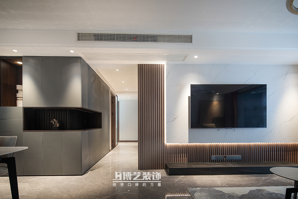 以简约为主基调的空间里,只在电视背景做简单的层叠设计,木格栅自带的凹凸感与平面的岩板用灯光为粘合剂组合,提升视觉美观性,拓展空间魅力。