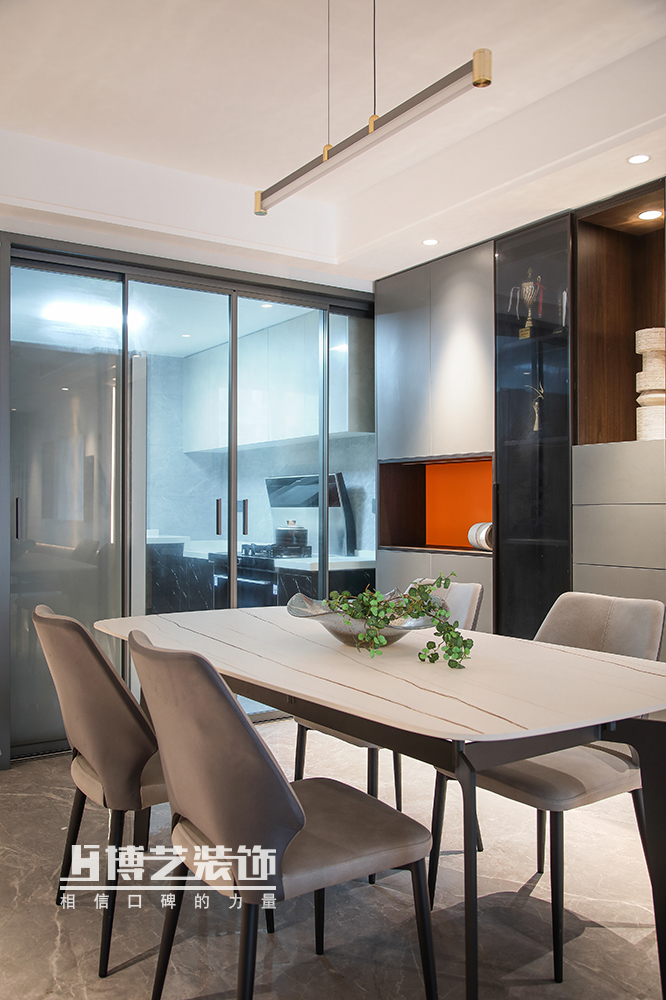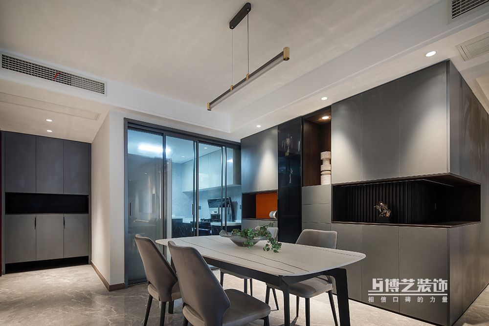 餐厅以深色沉静感官,深入浅出。联动转角打造餐边柜,平添几分灵巧,也可满足日常家居收纳。