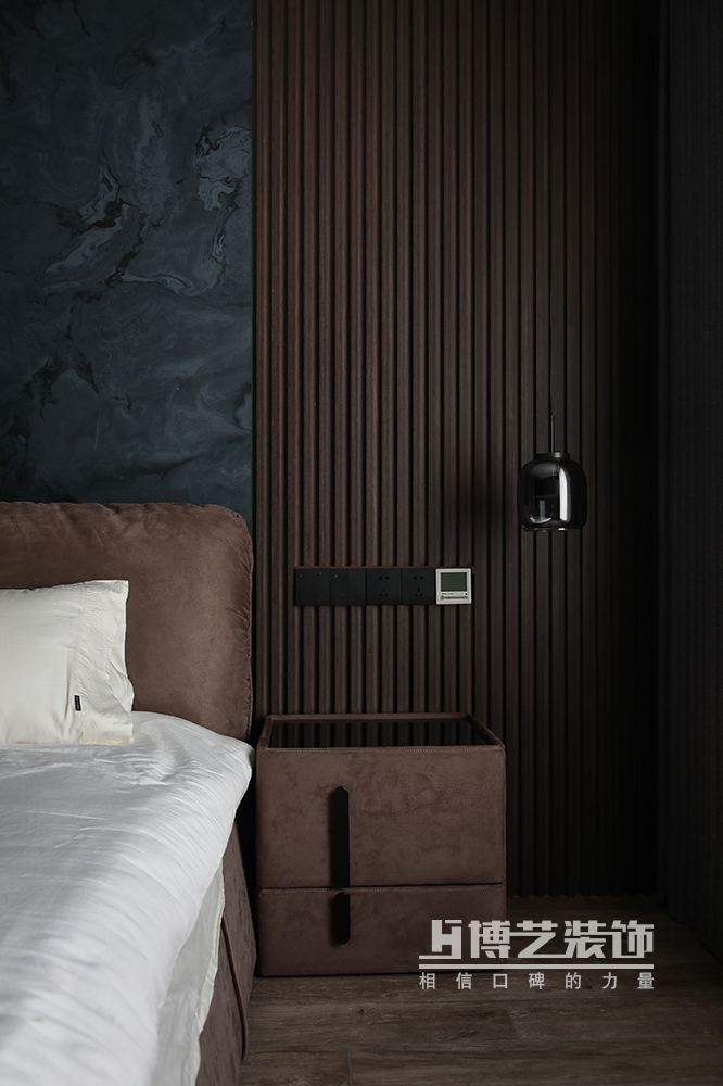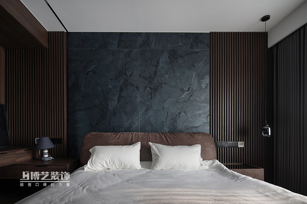 主卧的墙面以格栅搭配低度蓝色护墙背景,摒弃掉主灯,以氛围灯烘托营造静谧安定的睡眠环境。
