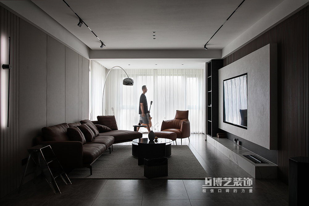 灰色的硬包墙面,线条疏密有致的排列,棕色的大转角皮质沙发,散发着亲近的味道,在家里可以温柔得随意,舒适得自然。
