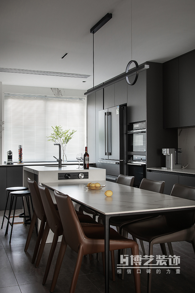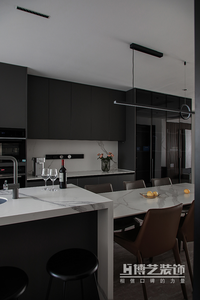岛台与餐桌相连,让空间不会过分空旷且狭长,两把高脚凳是两个人的慵懒随意,餐桌融入的就是一家人的天伦之乐。