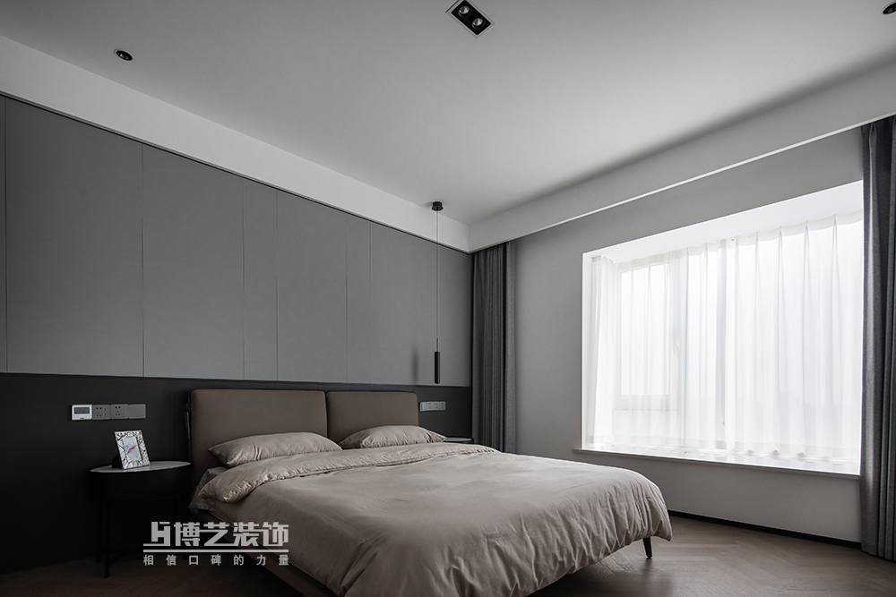 木饰面与硬包拼搭组合的床背景,融入线条的设计,不显单调。打开床头的灯落下温柔的夜,灰调让空间安静,棕色填补温暖,两个人的爱是包容,理解和陪伴。