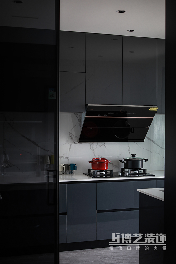 开放式的西厨空间,与客餐厅形成联动,回字形的动线,让家人之间的互动与沟通更加紧密且随意。