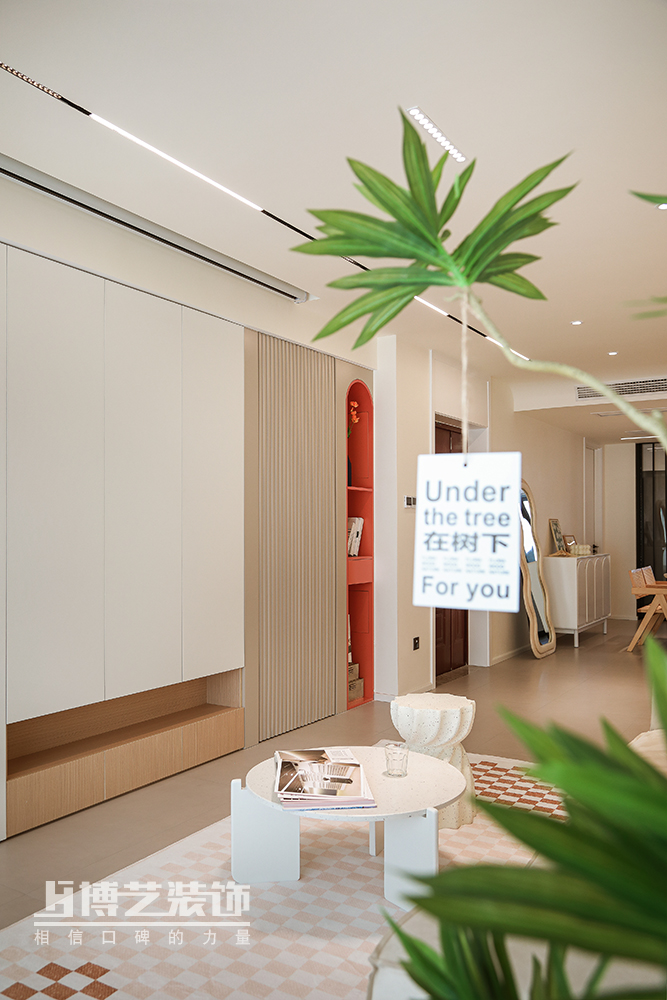 整体以自然的奶油风为主调,低饱和度的配色 搭配干净简洁的线条 再以绿植做点缀