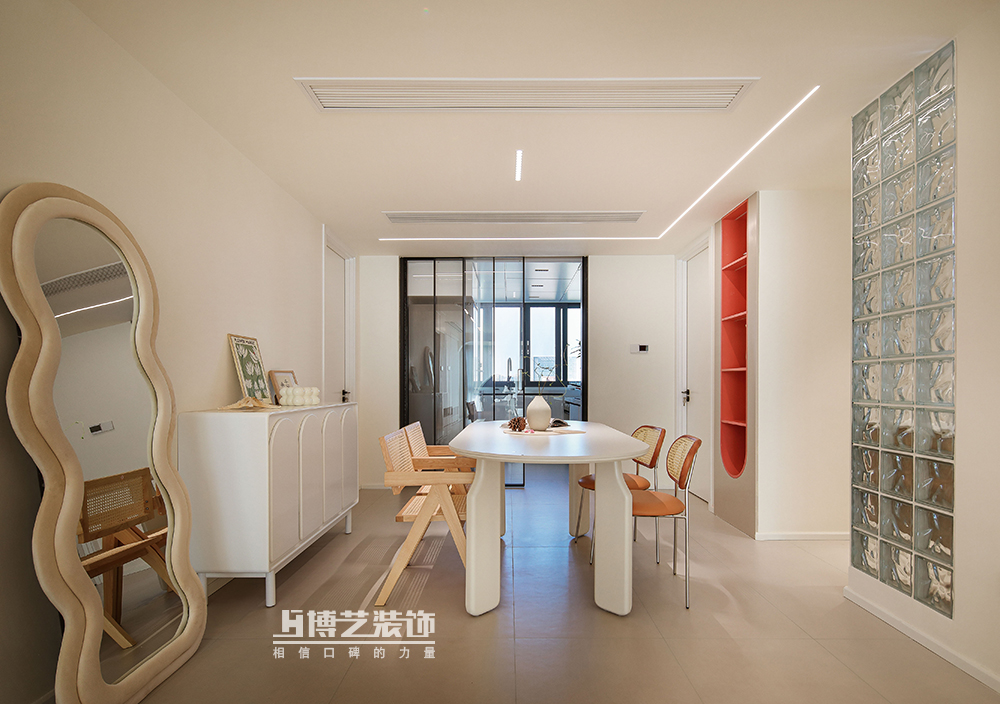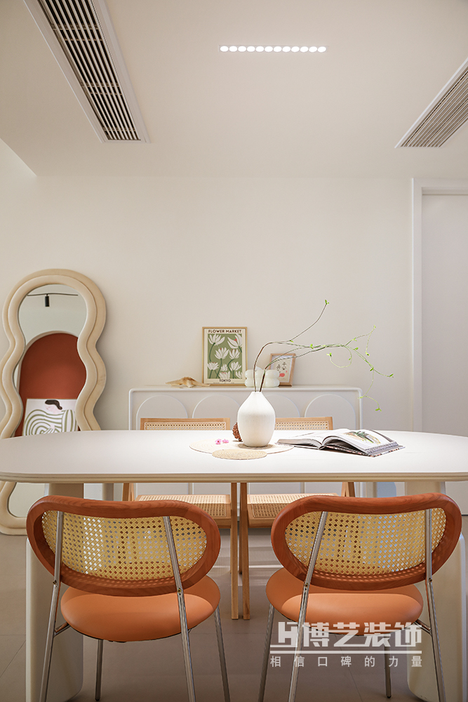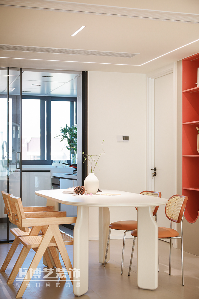 白色餐桌与藤编的木质椅让简约不简单,旁边红色的置物柜是春日里突然闪现的花朵,翩然入境。