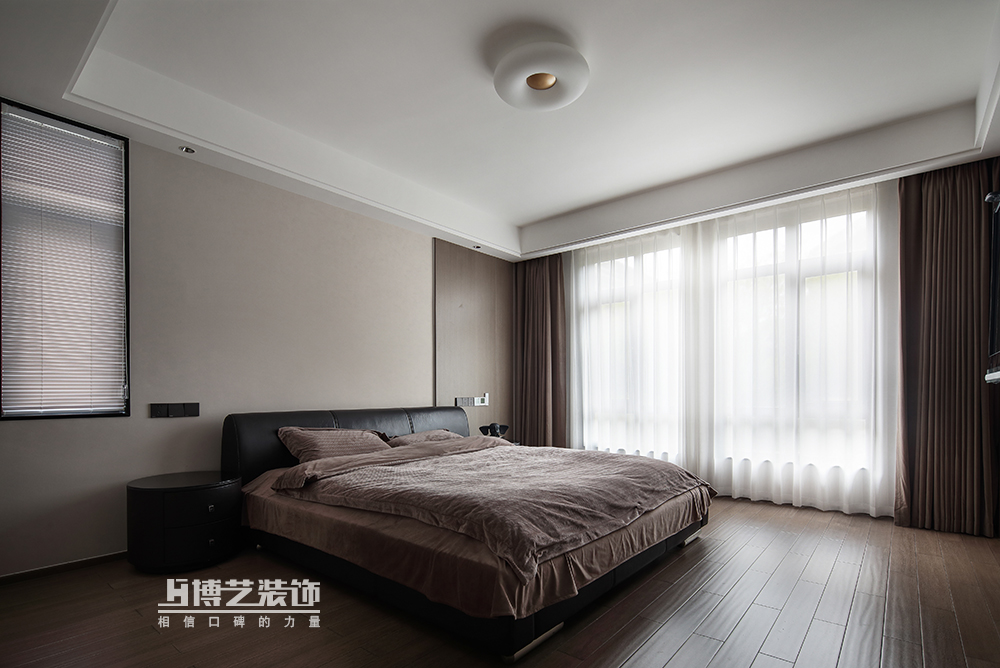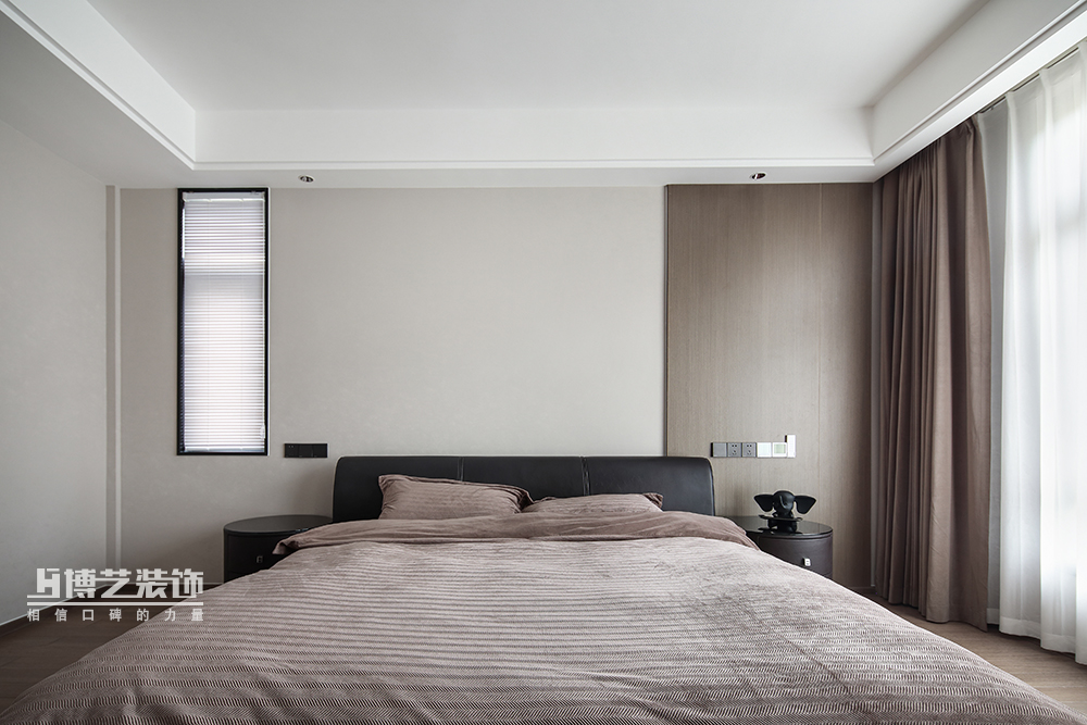 卧室采用不对称的设计,借原有的窗口与护墙制造有差别的视觉效果,暖咖色与黑色的搭配营造出空间温暖、稳重的氛围感,让身体与心灵得到真正的放松。