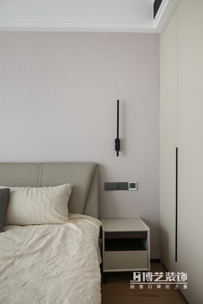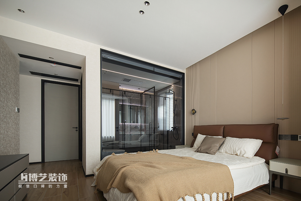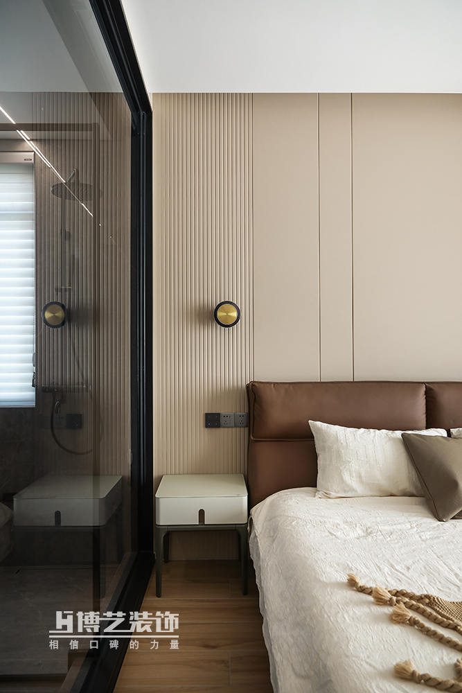 奶茶色的卧室空间,黑色沉稳带来满满的安全感,深咖色的床靠与白色床品堆叠丰富空间层次感,舒适与温暖,柔暖的环境进入深沉睡眠。