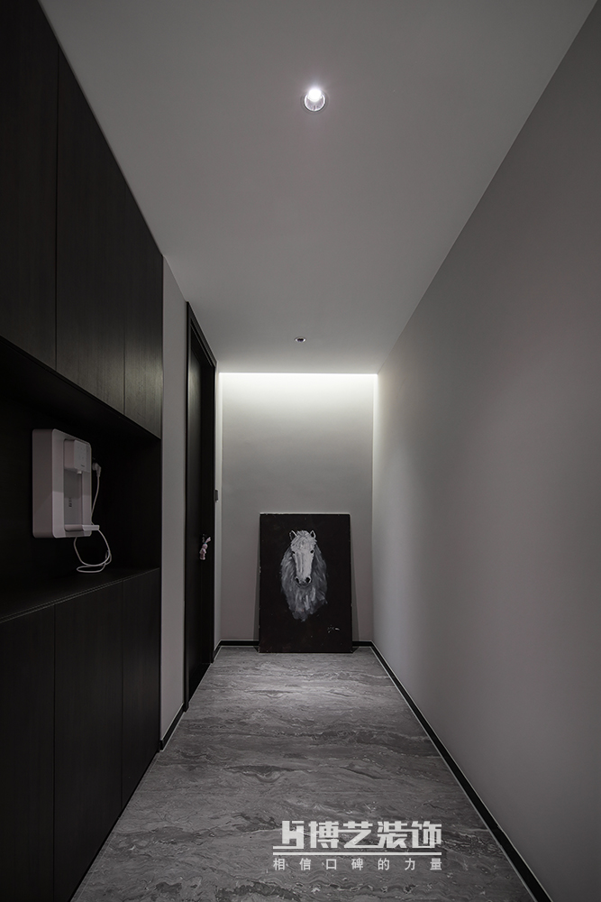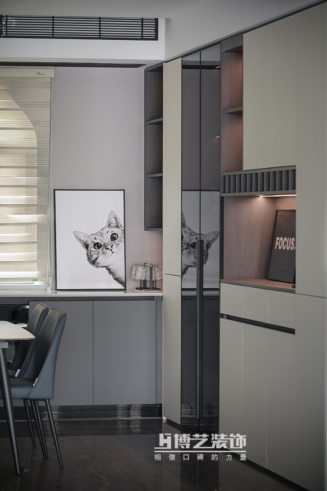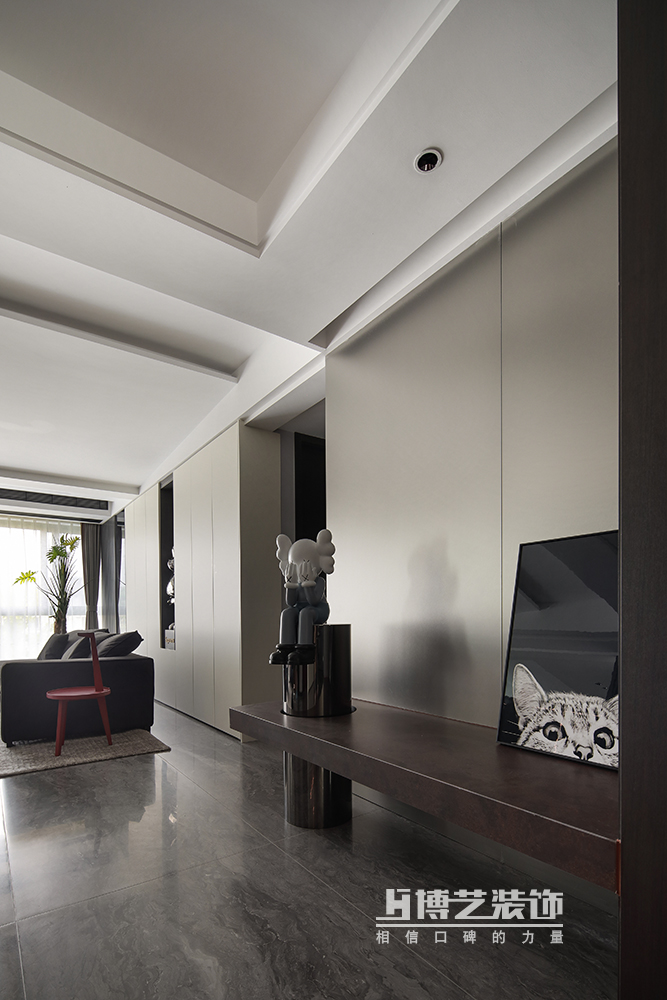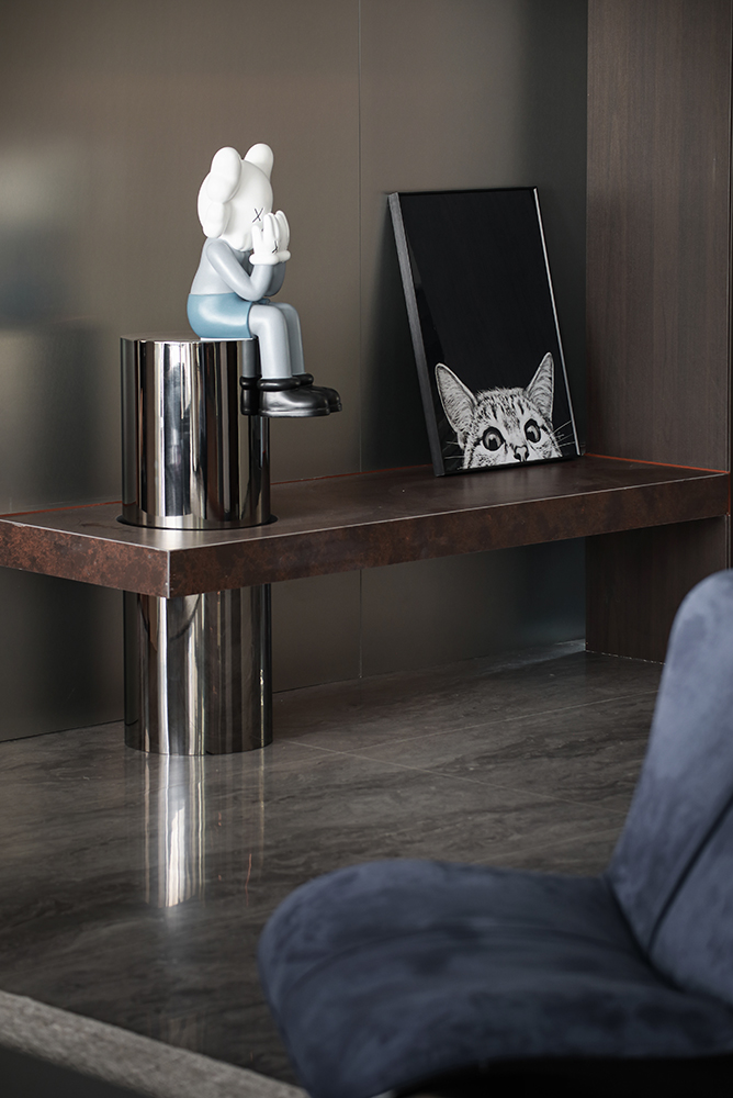 得益于一梯一户的优势,把鞋柜安置于门厅,让客餐厅部分更完整。玄关顺势利用柱子做入户造景,打破传统,给予开门的仪式感。Kaws网红公仔与亮面不锈钢的结合,精致又不失个性,别具一格的潮流风。