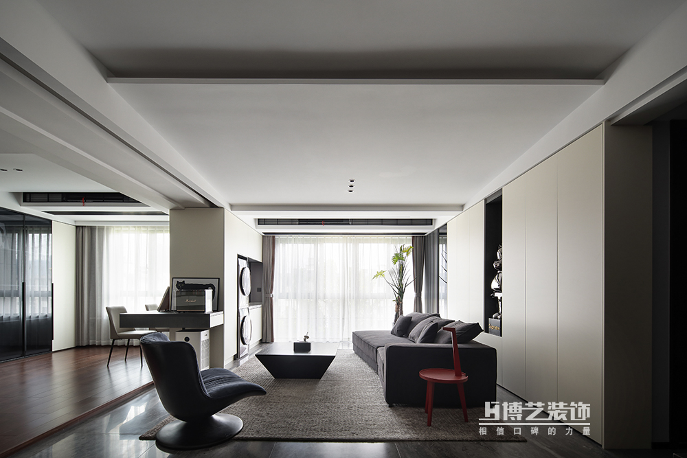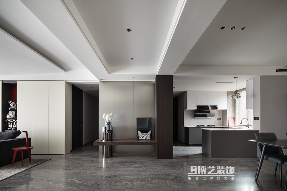 整体黑白灰的色调通过极简的手法融合,再加上一点点复古的红色,创造一个高级、舒适的居家环境。两侧的柜体兼具收纳及生活功能,满足生活上的需求。