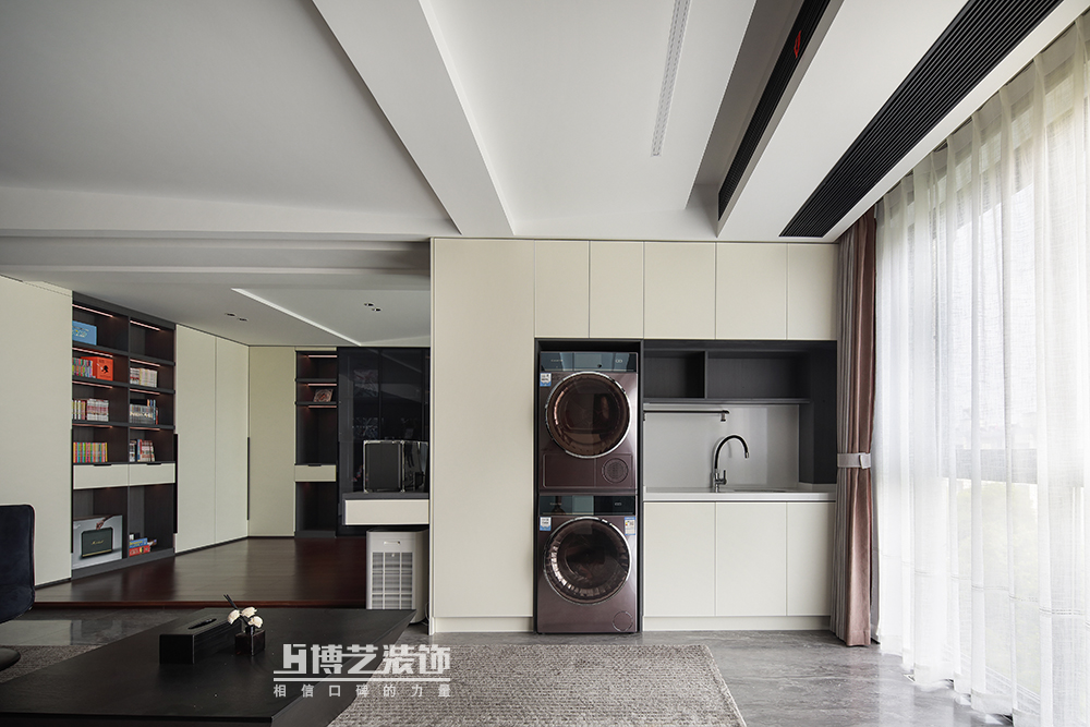 敞开式的书房可以与客厅合为一体,人多也不怕拥挤;未来ta也可以作为亲子游戏的场地。地台的设计与客厅形成一点落差把客厅与书房做出功能上的区分。L型的书柜是书本与业主“藏品”的归属地。