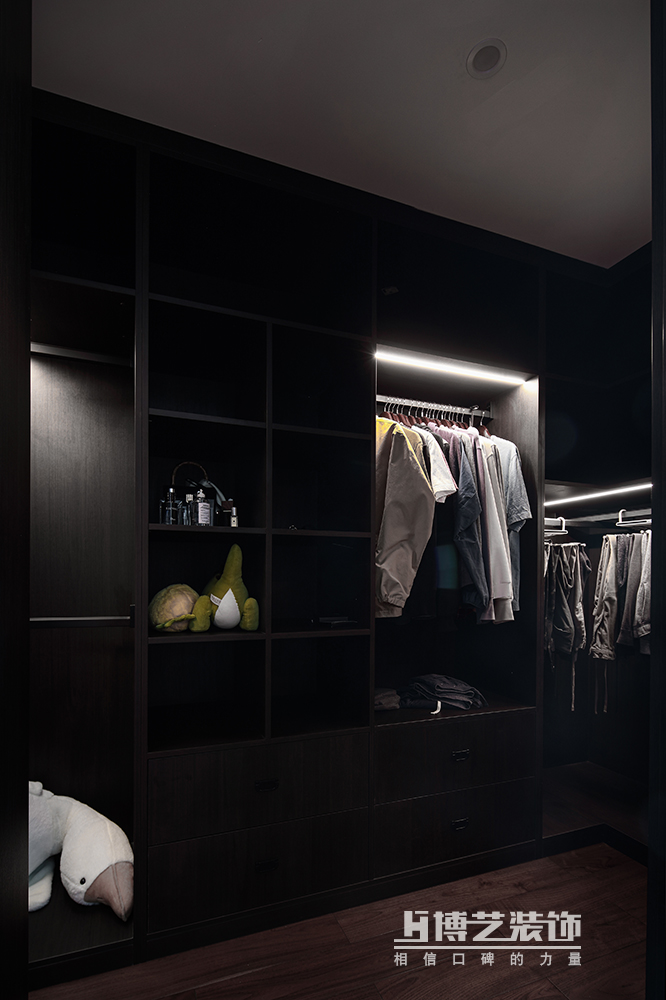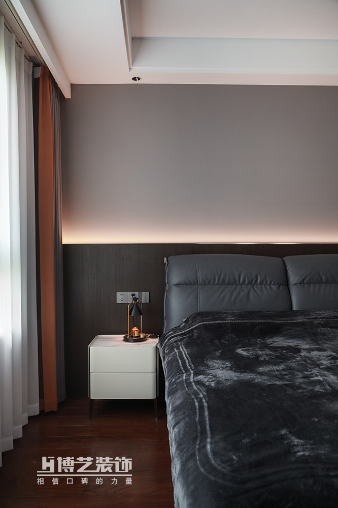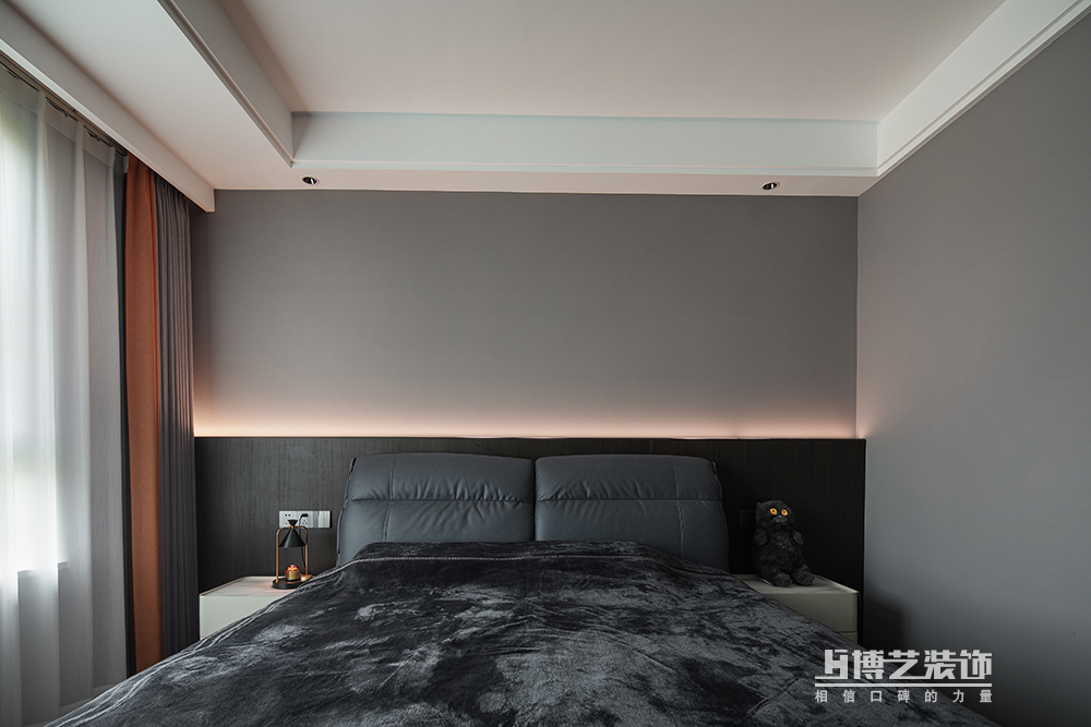 主卧依旧延续了极简的基调,暖灰色的空间点缀深蓝色的床靠,低饱和的色调有种莫名的治愈力,暗藏的灯光带来高级的氛围感,让烦躁的心瞬间归于平静,安心睡个好觉。