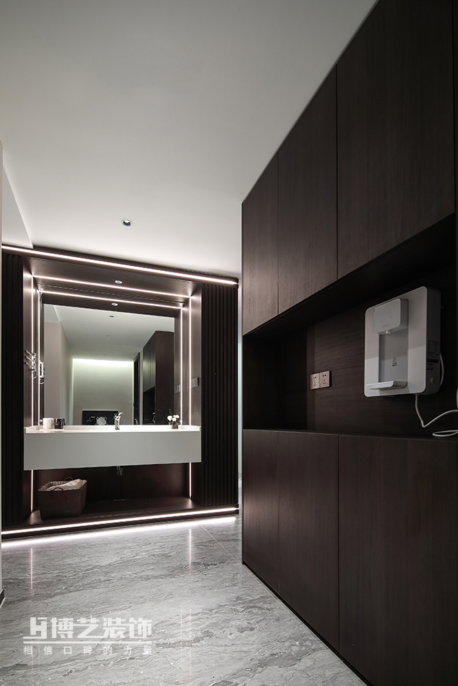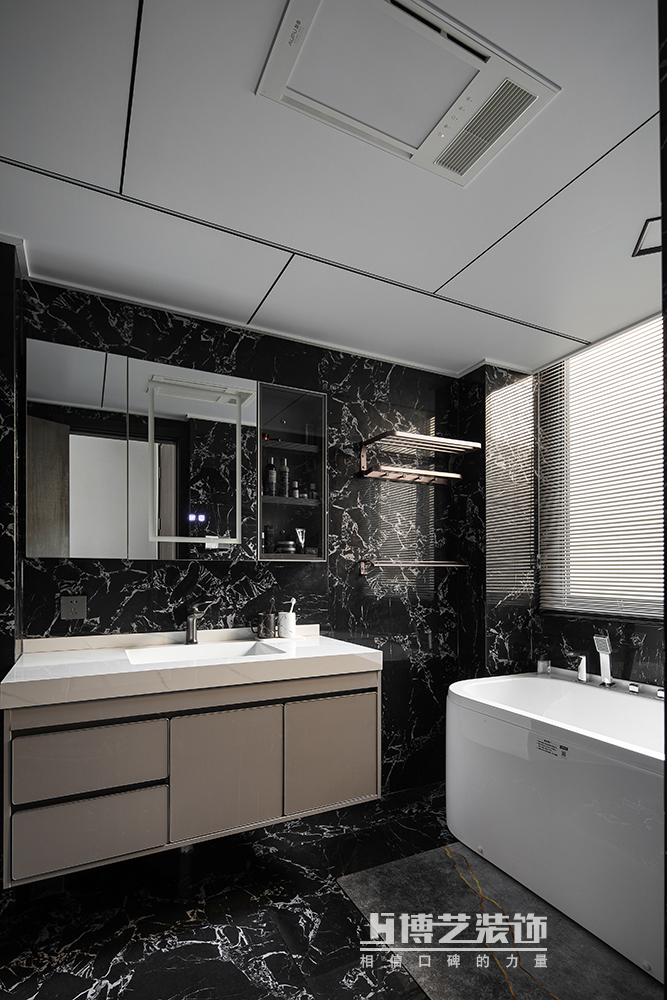 暗黑系的卫生间深邃、高级,白色张扬黑色收敛,极致的反差给空间带来别致的感官,增加个性的体验。