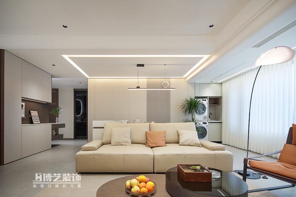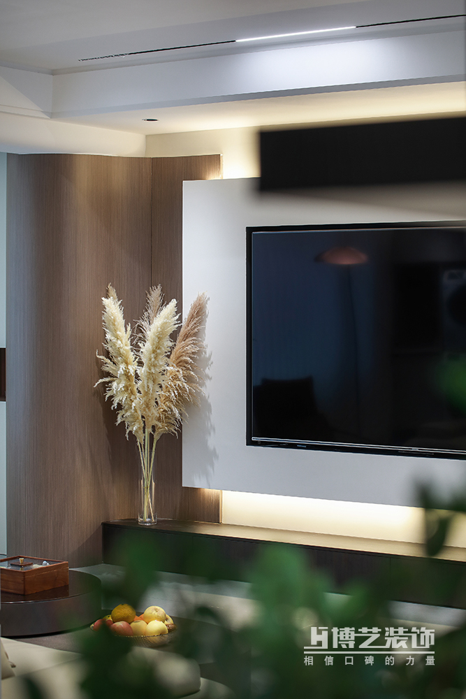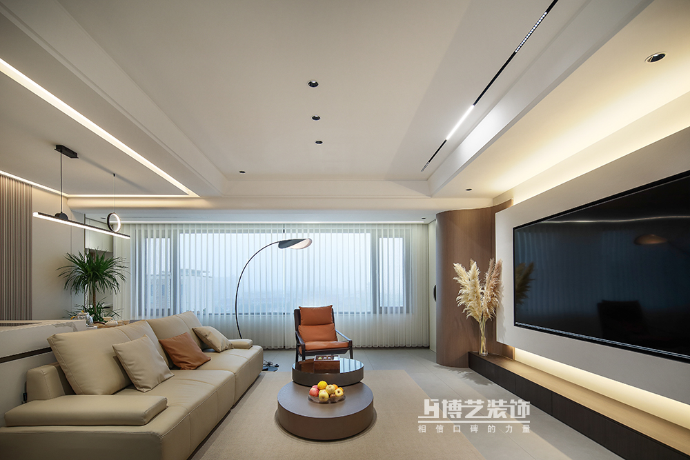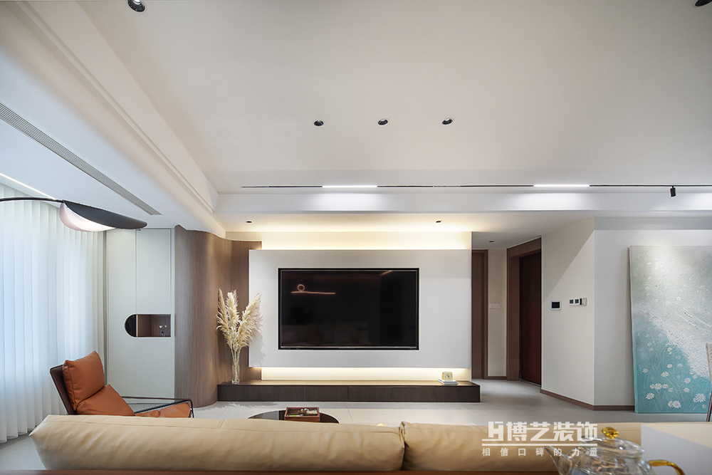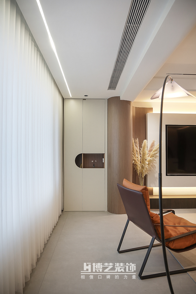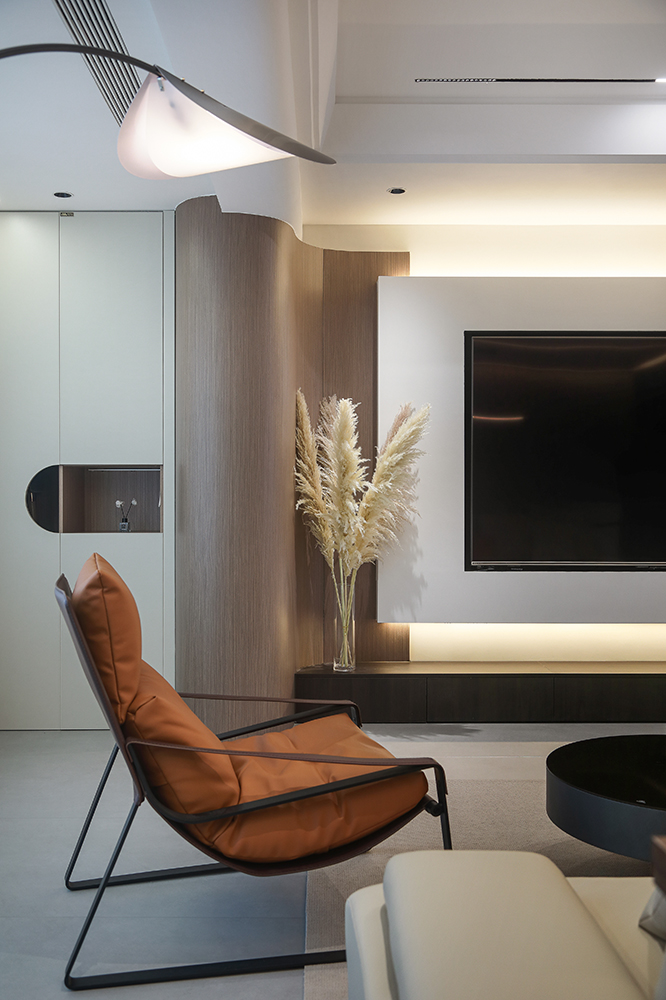 客厅与阳台打通,扩大空间,做弧形墙过渡,交互设计悬空电视墙,丰富空间形式,将设计感拉满。