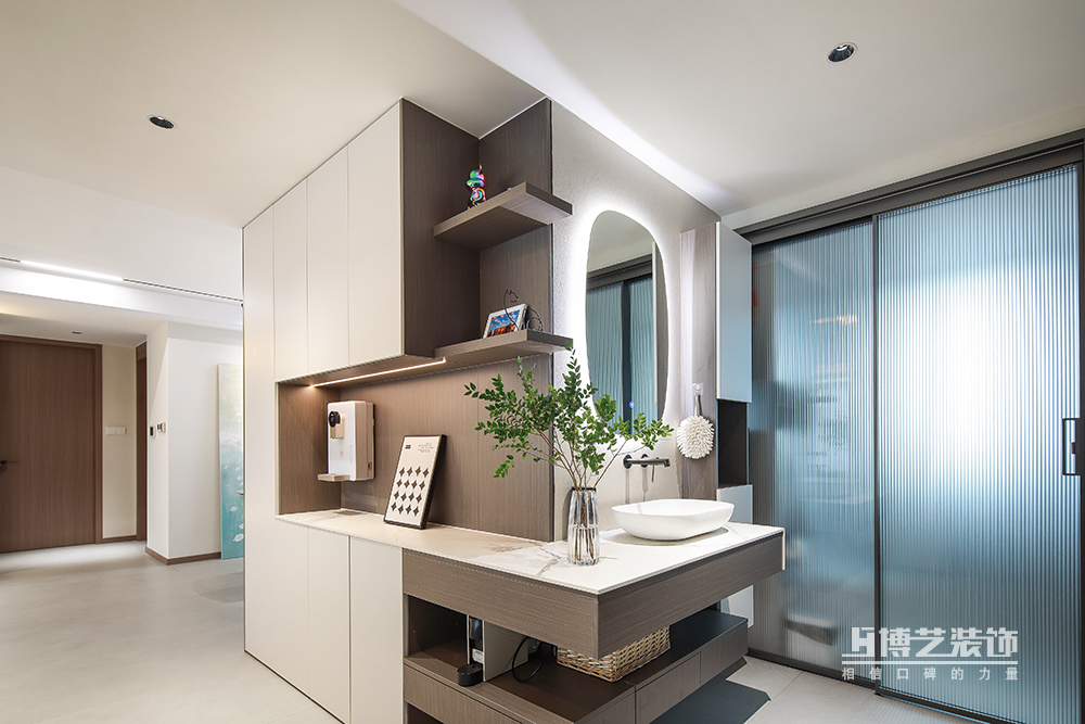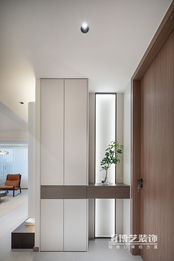 入户做通顶鞋柜,满足生活需求,利用穿插设计做延伸,搭配玻璃隔断透光、美观又实用。