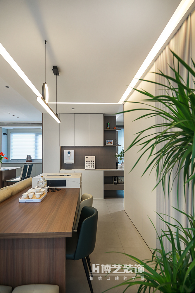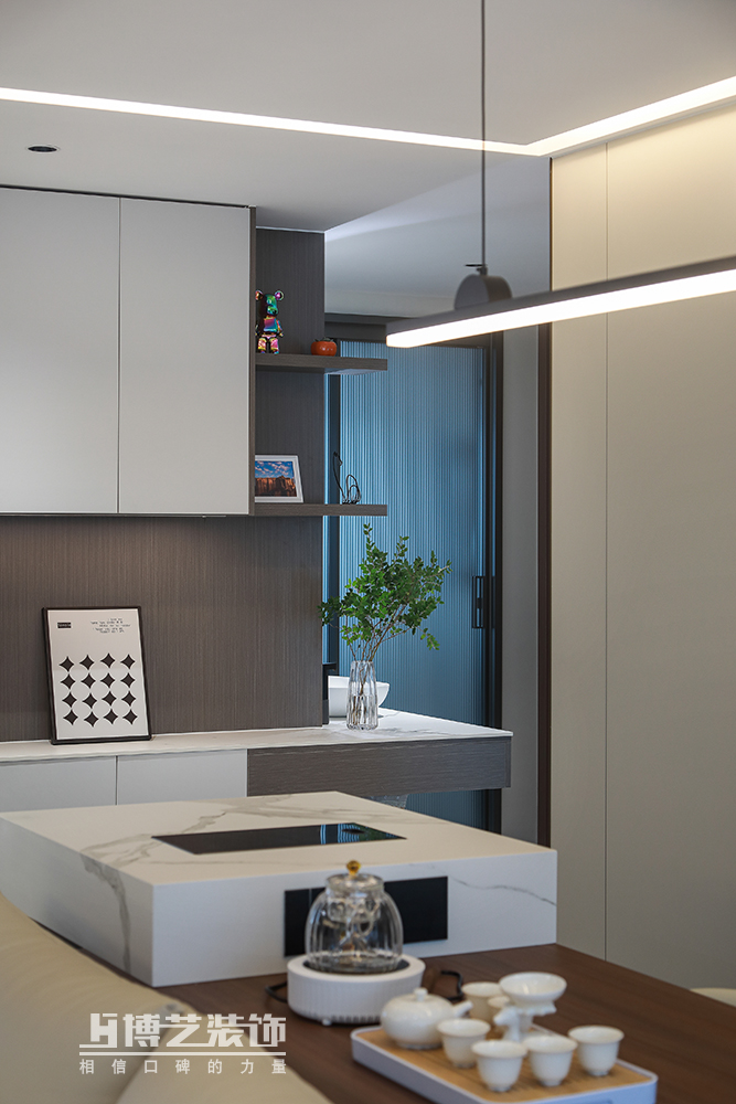 茶室与客厅相连,增加空间的通透性,同时也有利于增加家人间的互动与亲密,导台的设计让品茶更为科学方便。