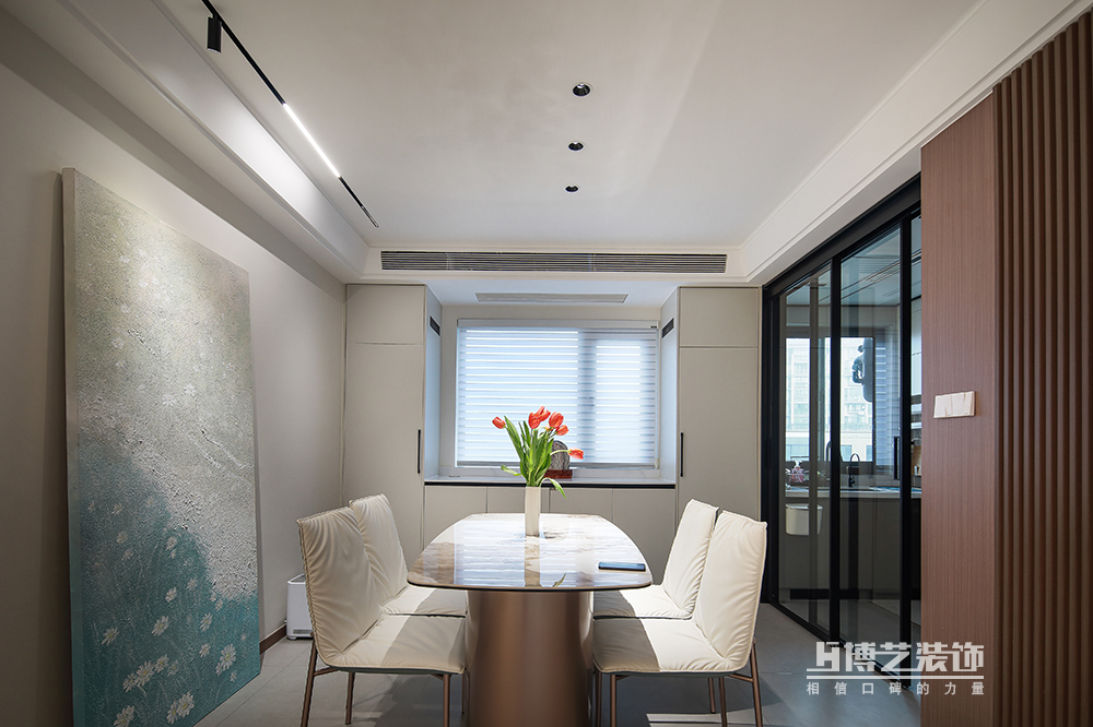 餐厅靠墙做柜子方便生活收纳,装饰画明丽清新,为就餐平添几分好心情。