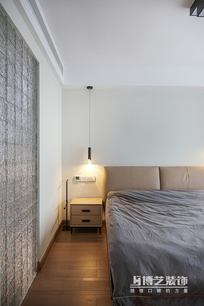 白色与奶咖色极简的运用,营造舒适静谧的睡眠环境,高低错落的床头灯让空间变得有层次,暖色调的光带来温柔主义的氛围。