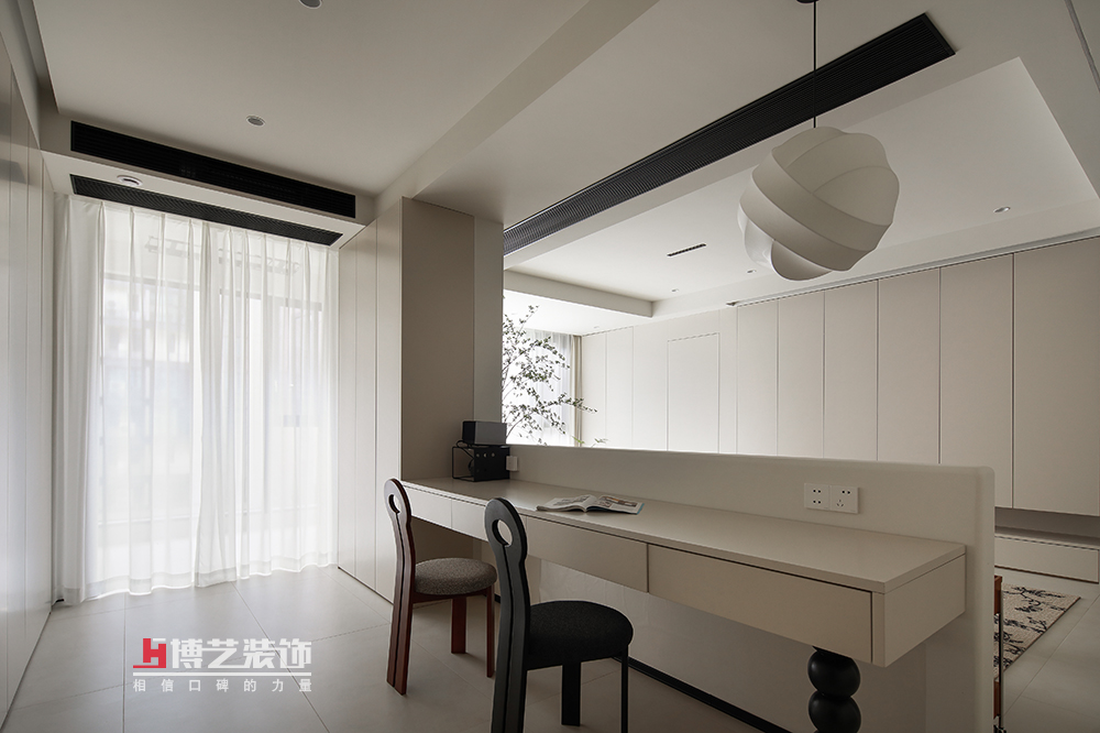 在客厅背面,与之紧紧相连的是一个开放式书房,区别于传统密闭空间的书房,我们将书房进行了空间上的外放。不论是居家办公,还是闲时阅读创作,既能有一方专属的天地,又让自己不闭塞于物理空间中,创作思绪也随之自由挥发。桌子、柜子的半隔断设计,不仅区分了两个空间,还兼具家居存储收纳作用。