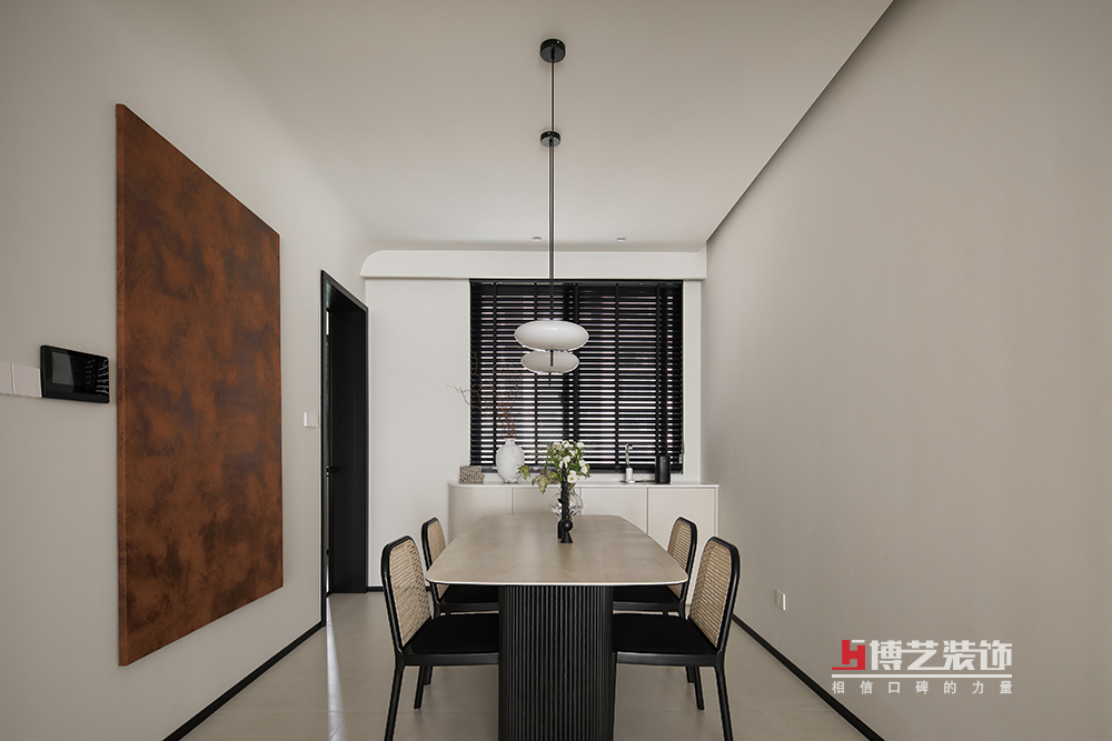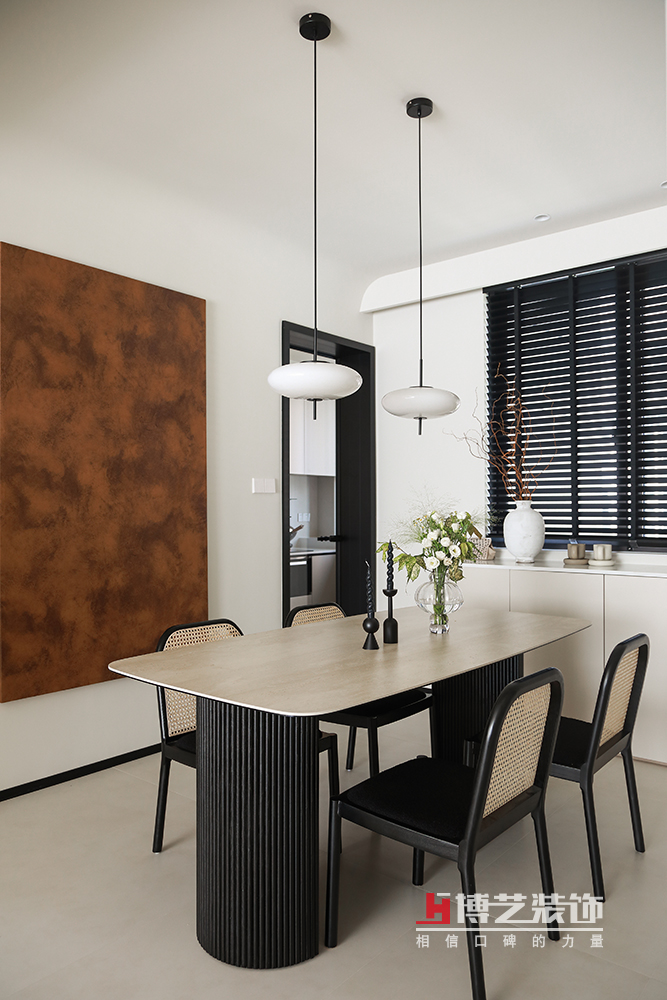两盏圆形吊灯,一张方形餐桌,自古“天圆地方”的设计理念在餐厅得到了很好的展现。黄褐色的大幅装饰画,又给餐厅黑白空间中注入了一剂更坚定柔和的力量,让餐厅空间的色彩不至于单调。